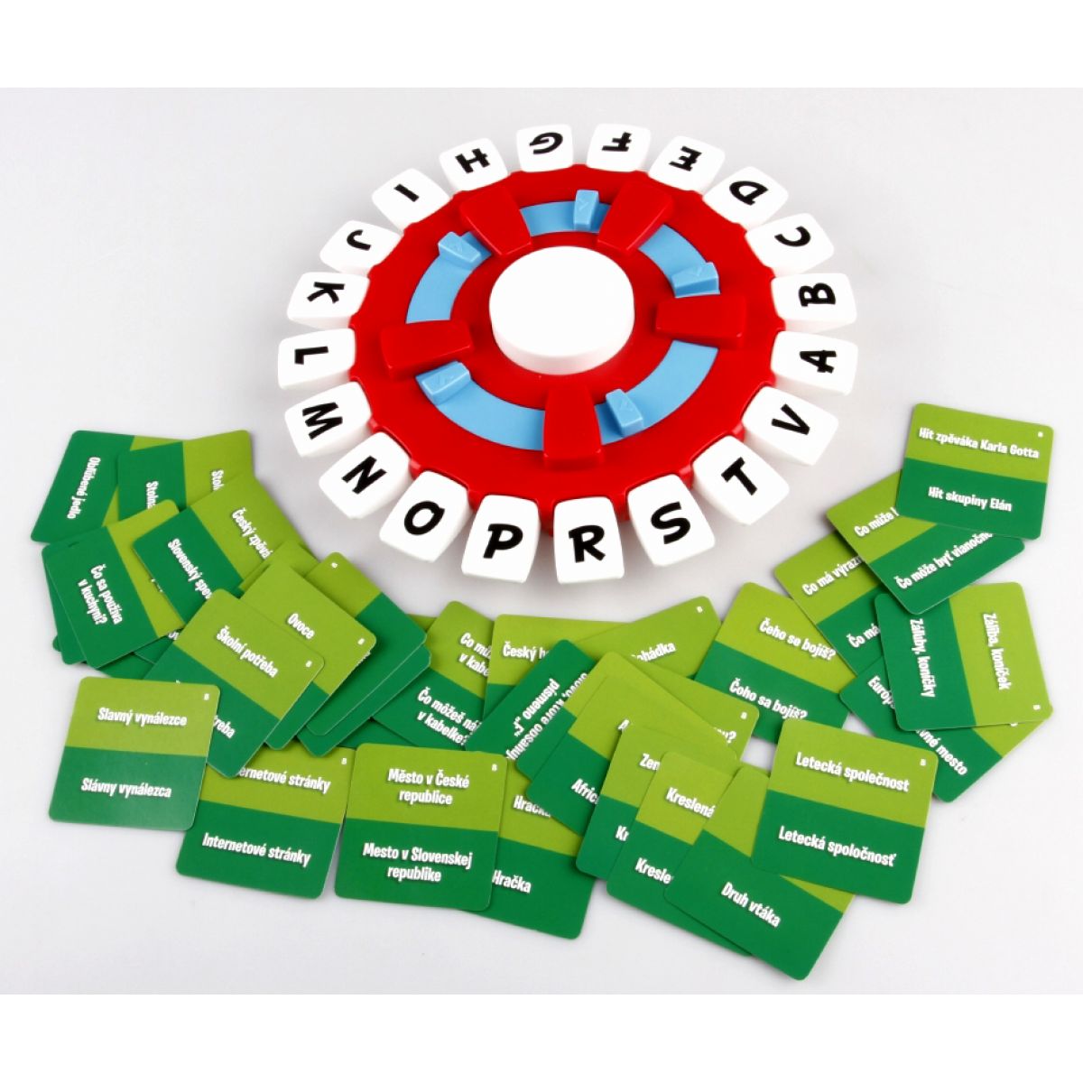 Balení obsahuje: 36 karet (oboustranných=72 otázek) a základnu abecedy.