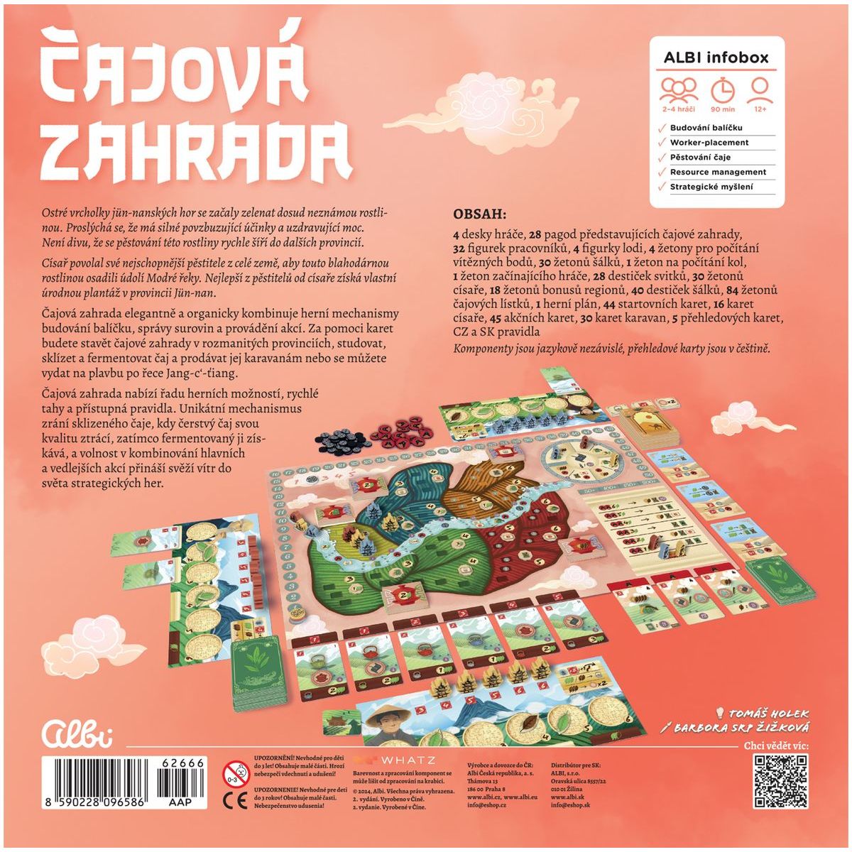 Vstupte do starověké Číny, kde se v údolích kolem Modré řeky začíná rodit legenda o prvních čajových zahradách. Ve strategické hře Albi Čajová zahrada se stáváte jedním z pěstitelů, které císař povolal, aby rozšířili pěstování této výjimečné rostliny. Stavíte nové zahrady, řídíte pracovníky, sklízíte, fermentujete a prodáváte čaj karavanám či lodím putujícím po řece Jang-c’-ťiang – a tím krok za krokem budujete svůj příběh i slávu.