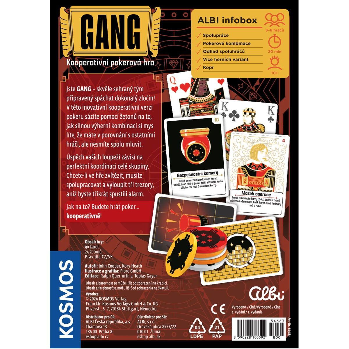 Staňte se členem dokonale sehraného gangu v kooperativní hře Albi Gang, kde poker hrajete jako tým. Sází se na sílu karet, plánuje strategie a koordinují akce bez slov. Dokonalá spolupráce je klíčem k úspěchu – vyloupit 3 trezory, aniž byste spustili alarm třikrát. Hra je vhodná i pro začátečníky a kombinuje napětí pokeru s týmovou strategií a zábavou pro všechny hráče.
