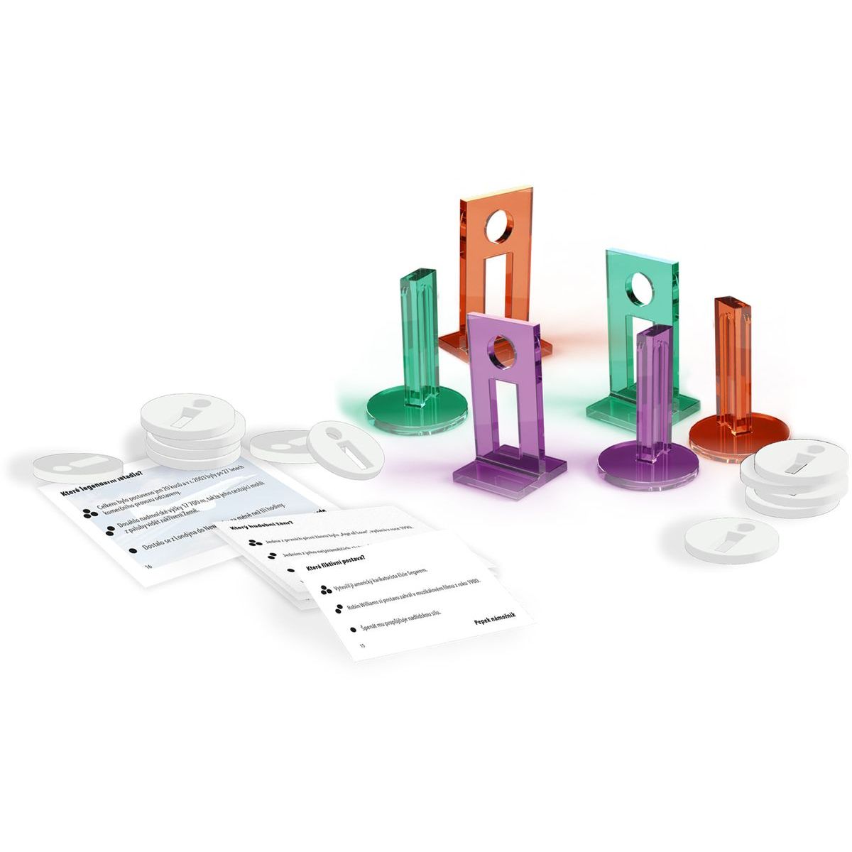 Obsah balení: 400 karet, 1 herní plán, 4 iKNOW figurky, 4 iBET figurky, 35 žetonů (20 bílých a 15 černých), pravidla hry