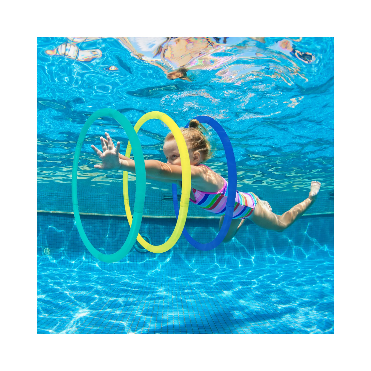 Tři velké plastové kruhy se díky závaží udrží pod vodou a vytvoří originální překážkovou dráhu. Proplouvání kruhy podporuje pohyb, trénuje potápění a přináší spoustu letní zábavy dětem i dospělým.