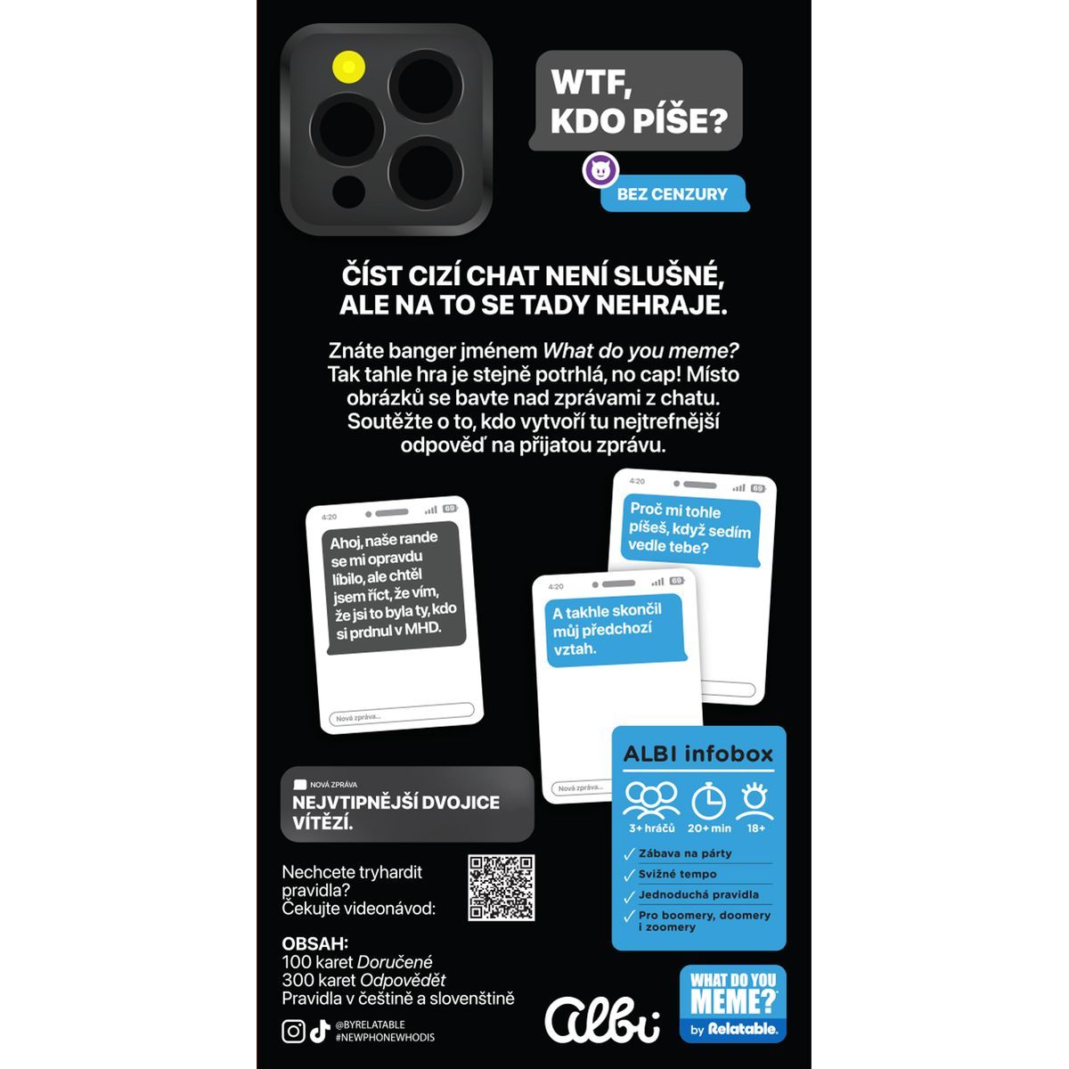 Zažijte zábavu s Albi WTF, kdo píše?, párty hrou, která baví všechny závisláky na messengeru! Hráči soutěží, kdo najde nejvtipnější a nejtrefnější odpověď na danou zprávu. Ideální na večírky, setkání s přáteli nebo jen pro smích při rodinném hraní. Hra rozvíjí kreativní myšlení, humor a rychlou reakci.