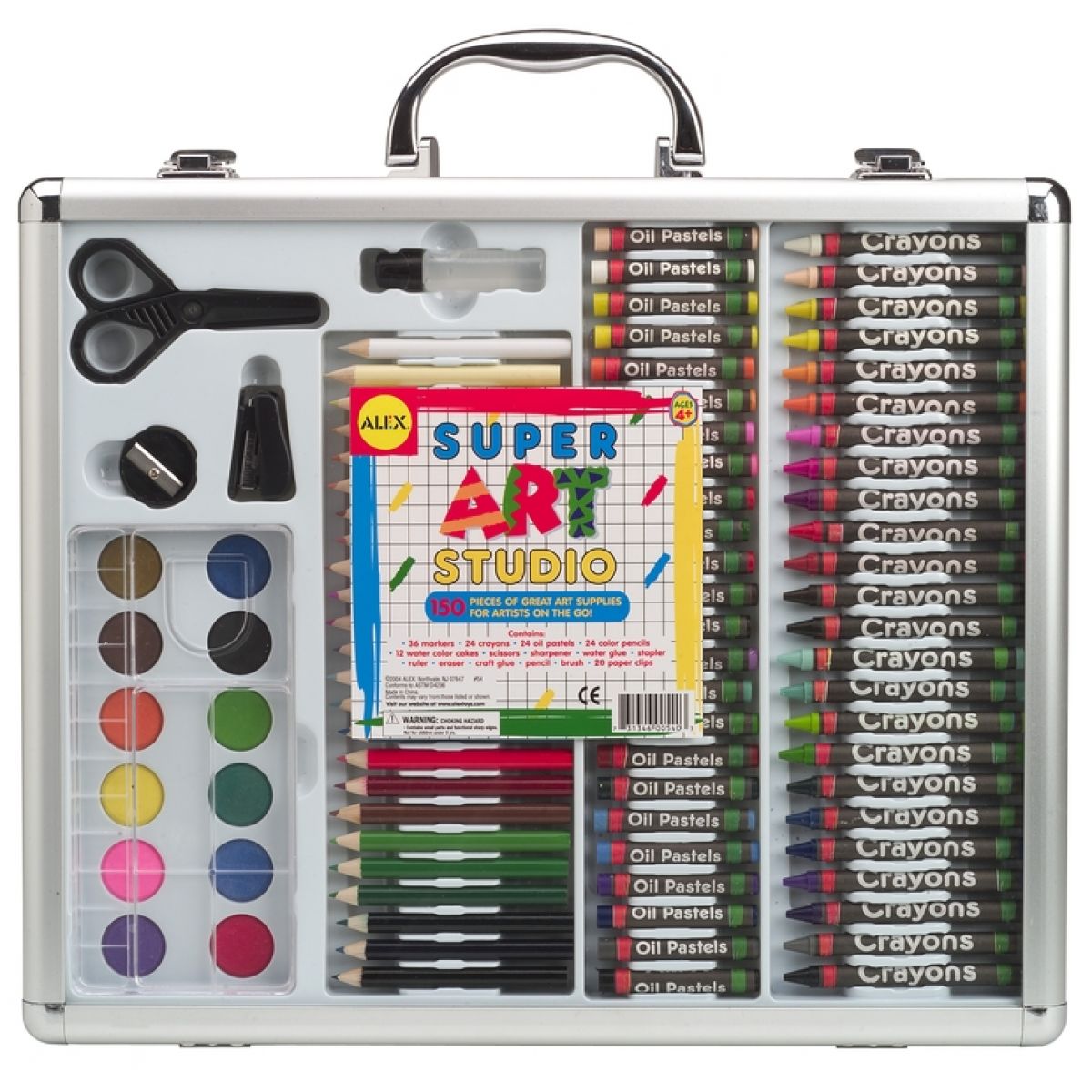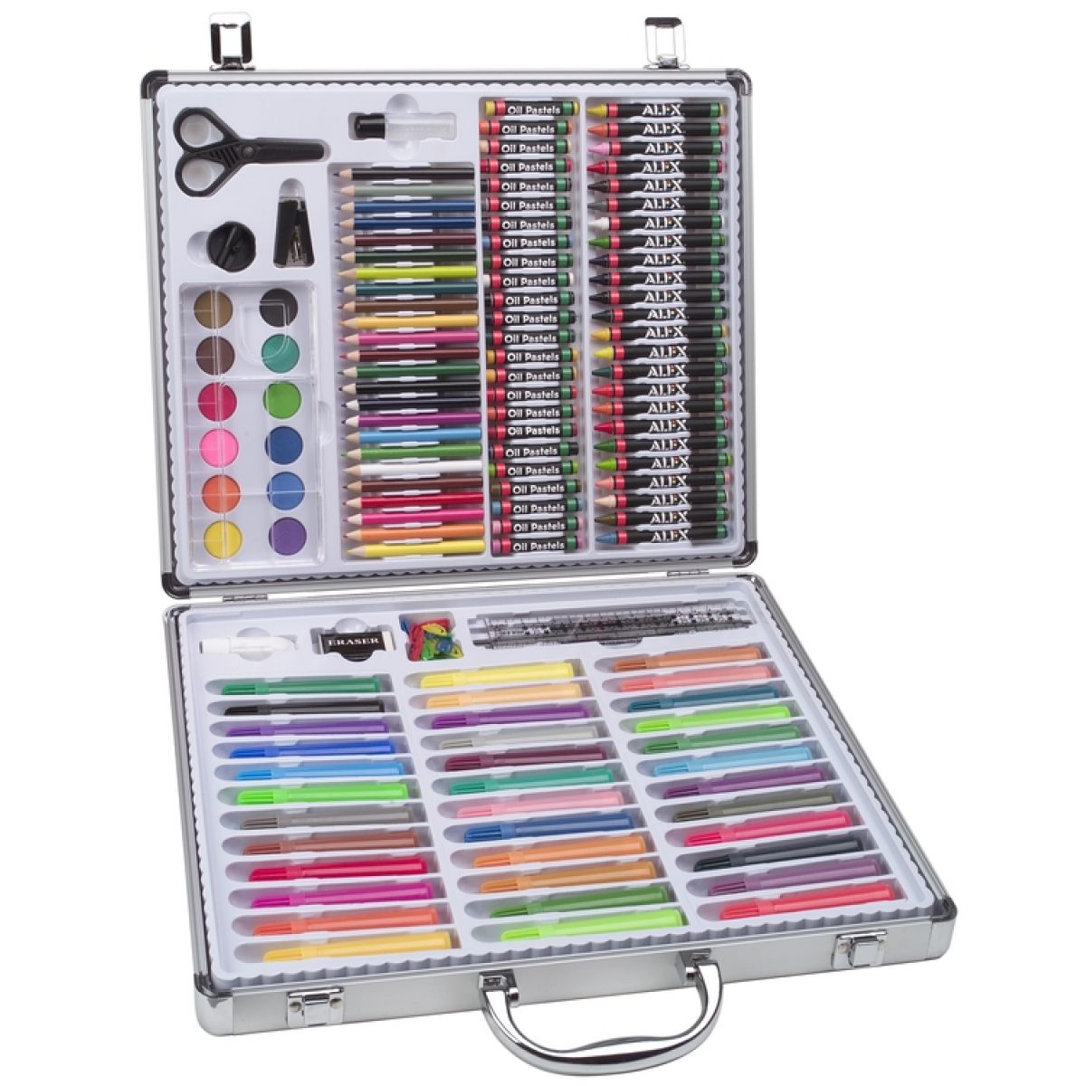 ALEX 54 - Kufřík s pastelkami a barvami kov oboustranný 37x30cm. Odolý hlnikíkový kufr obsahuje 150 nezbytností pro malé výtvarníky. Voskovky, pastely vodovky, fixy, štětec...