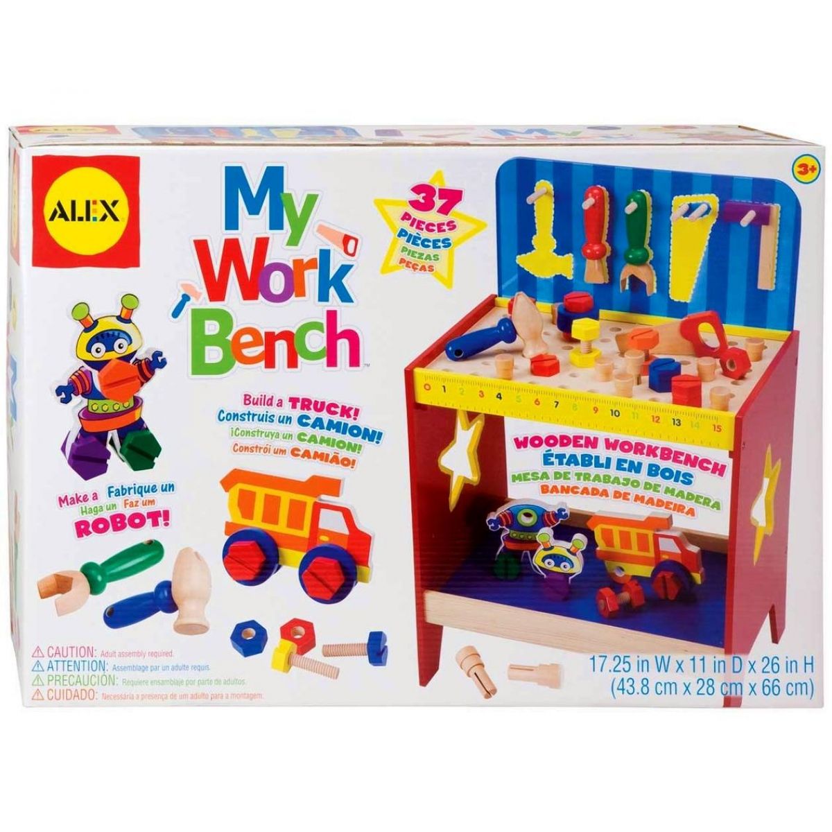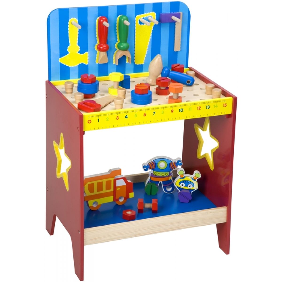Dětský dřevěný ponk s nářadím a hračkami. Celkem 37 dílků.