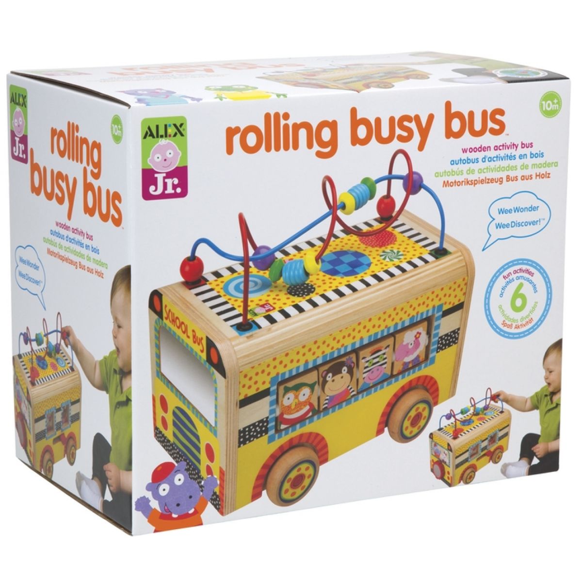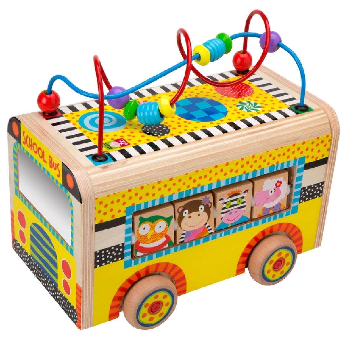 Dřevěný autobus obsahuje korálkové bludiště, kluzáky na oknech, otáčecí obrázky, zrcadlo a rolovací kolečka.