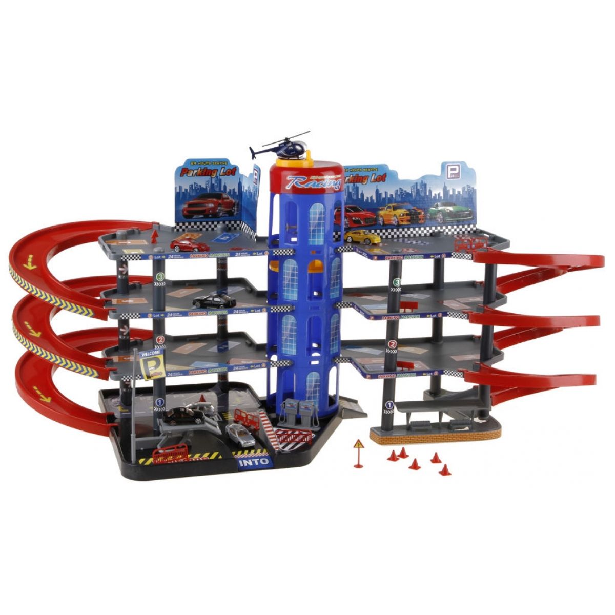 Velká plastová garážová sada má čtyři podlaží, čerpací stojany, výtah. Sada obsahuje dopravní značení, šest kovových autíček a vrtulník.