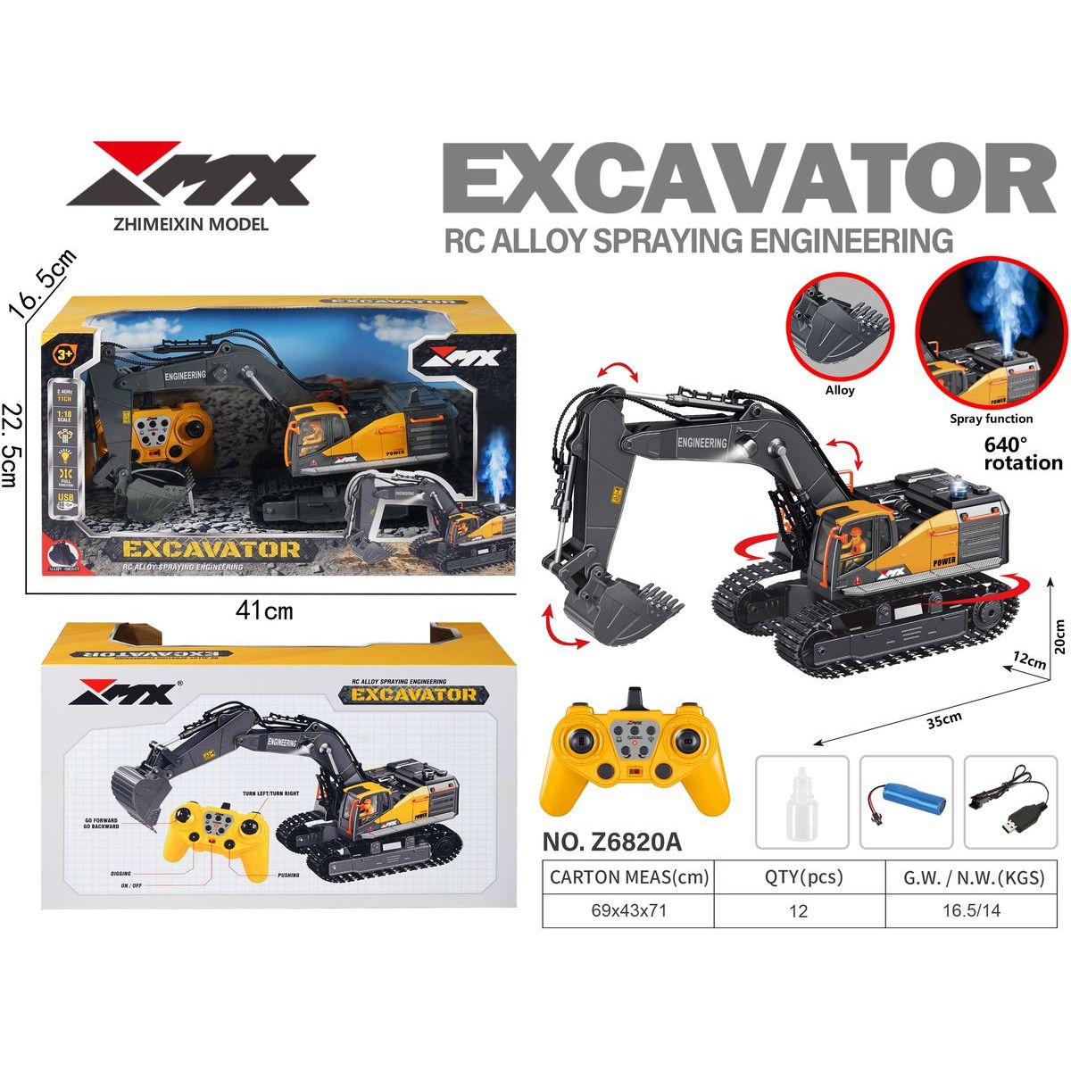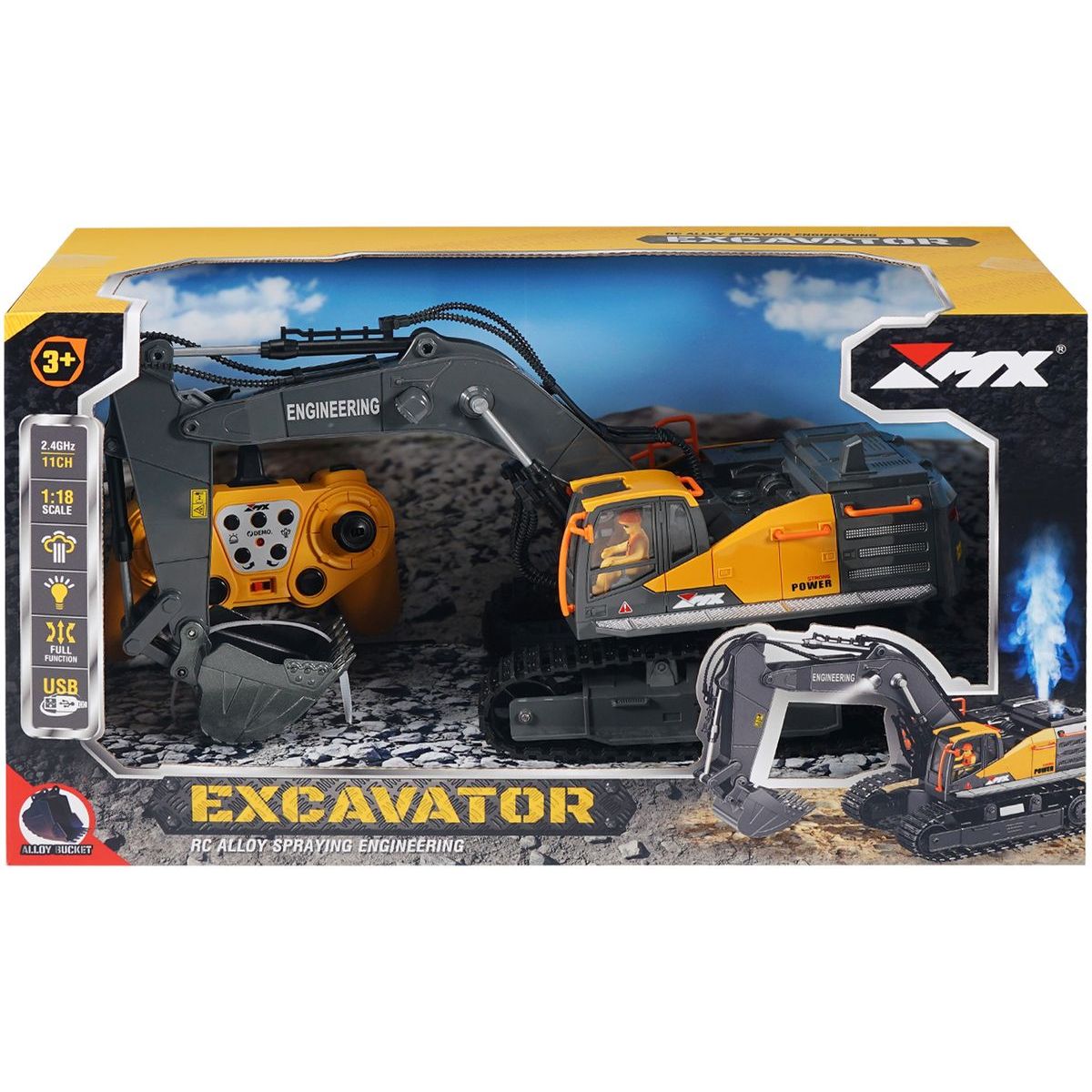 Výkonný RC bagr s realistickými funkcemi, kovovým ramenem a efektem páry pro dokonalý zážitek ze stavby! Tento 11kanálový model v měřítku 1:18 nabízí kopání, tlačení, otáčení věže až o 640°, světelné a zvukové efekty a automatickou demonstrační funkci. Stabilní provoz zajišťuje 2.4GHz ovládání s dosahem až 30 m. Nabíjení přes USB. Specifikace: 11 kanálů, plně funkční ovládání Funkce: kopání, tlačení, otáčení, jízda vpřed/vzad Otočná věž 640° Světelné a zvukové efekty + efekt páry (spraying) Automatická demonstrační funkce Měřítko: 1:18 Frekvence: 2,4 GHz (2405–2475 MHz) Max. výkon: 0 dBm Dosah ovladače: 20–30 m Rychlost: 2–3 km/h USB nabíjení Ideální pro malé i velké nadšence stavební techniky – s realistickým zpracováním a odolnou konstrukcí.