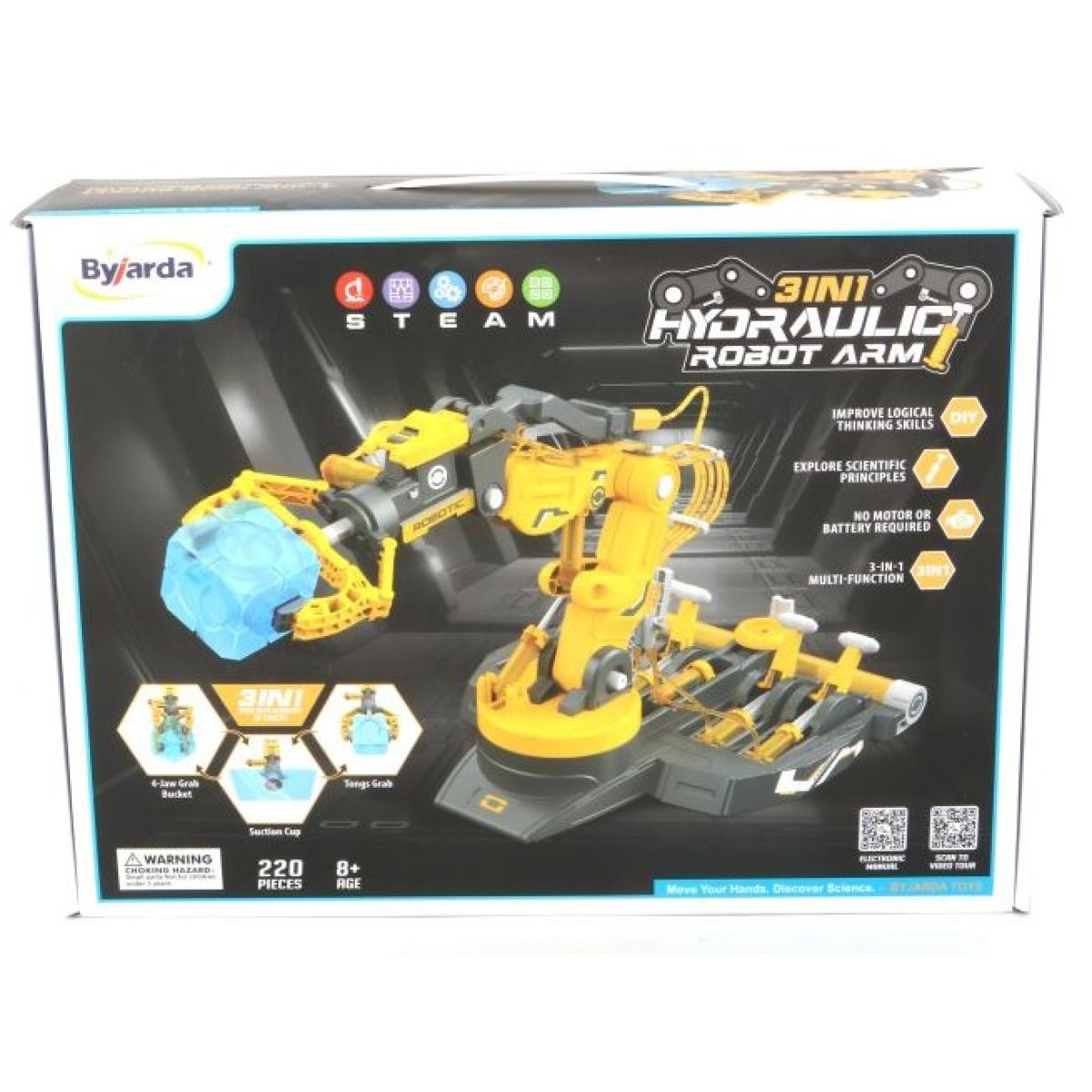 Robotické rameno 3v1 (220 ks) je jedinečná vzdělávací stavebnice, která umožňuje dětem i dospělým pochopit principy hydrauliky prostřednictvím zábavného experimentování. Funguje bez baterií a motoru – pohyb zajišťuje tlak vody, který ovládá jednotlivé části ramene. Model dokáže uchopit různé předměty, použít přísavku nebo využít hydraulický úchop, a tím ukazuje, jak lze přenášet sílu a pohyb pomocí kapaliny.