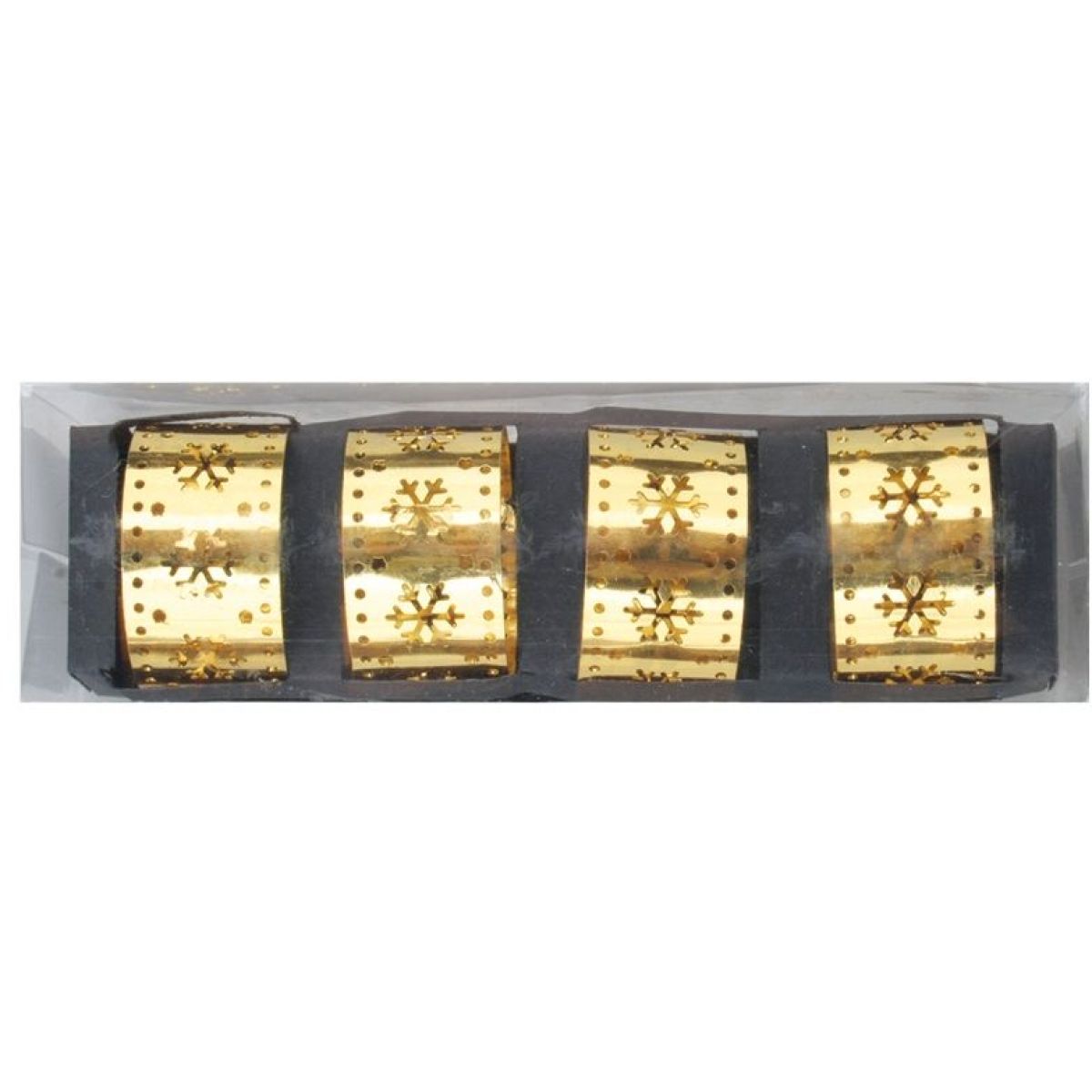 Ozdobte si sváteční stůl těmito krásnými kovovými kroužky na ubrousky s motivem vloček! Čtyři zlaté kroužky o průměru 4,5 cm dodají vašemu prostření tu pravou vánoční pohodu a eleganci. Jsou vyrobeny z pevného kovu a jsou skvělým doplňkem ke každé slavnostní večeři. Užijte si společné chvíle u stolu s touto jednoduchou, ale působivou dekorací.