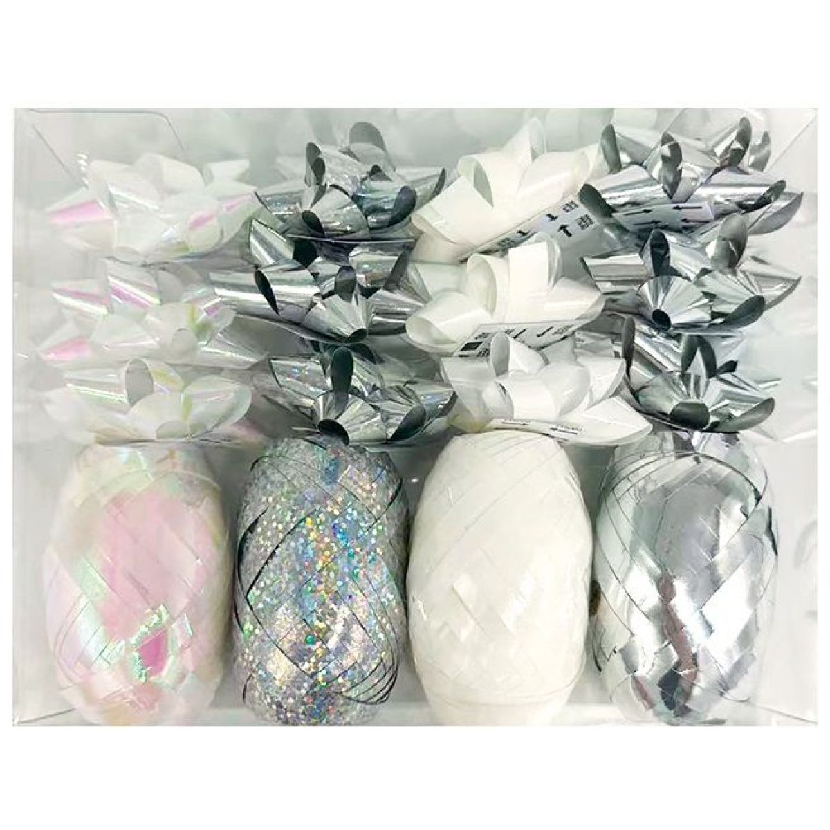 Anděl Přerov Sada na balení dárků stříbrná, rozeta 5 x 2 x 5 cm 12 ks, stuha 0,5 cm x 10 m 4 ks