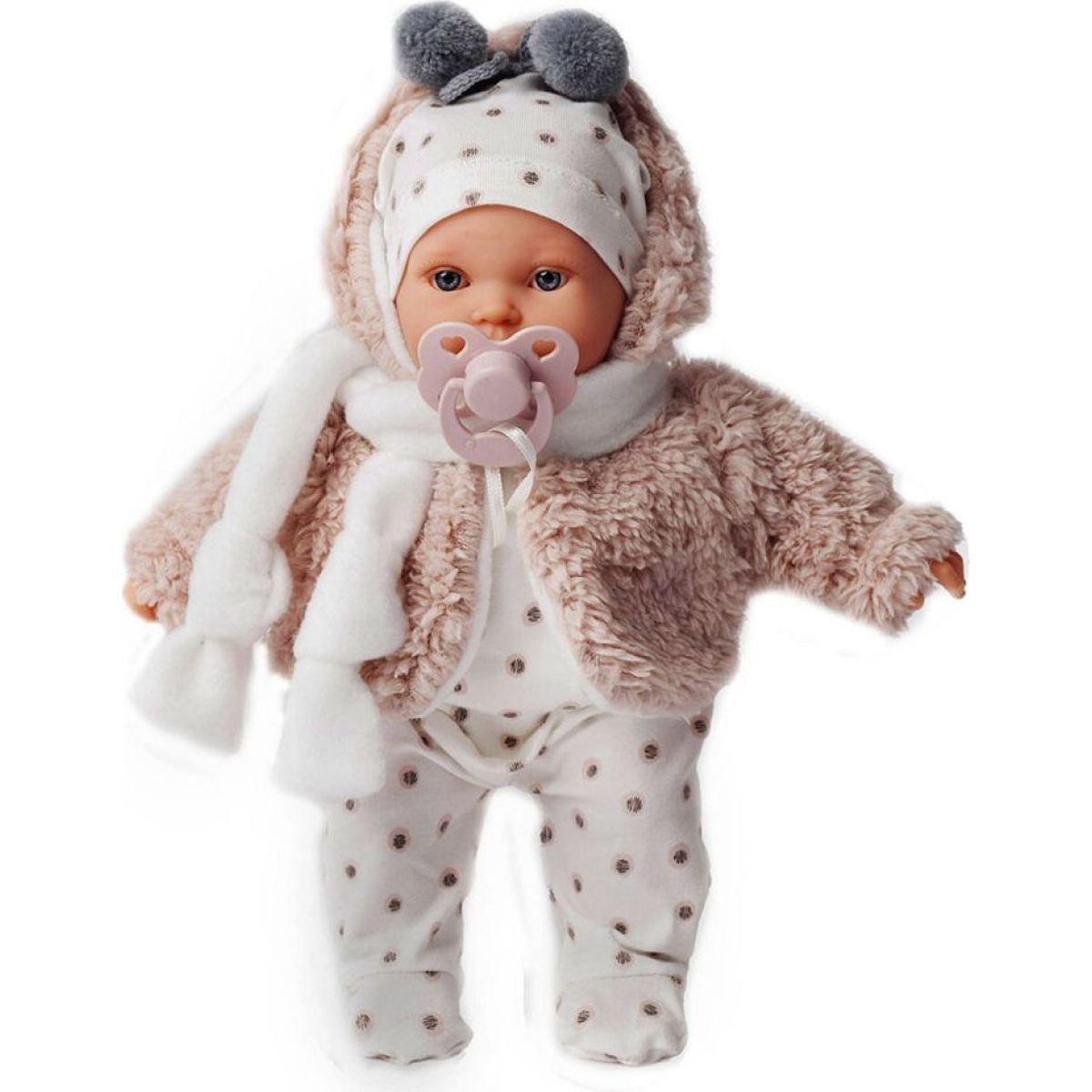 Postavička má měkké látkové tělo, hlava a končetiny jsou z vinylu. Obleček má z materiálu příjemného na dotek. Tentokrát má oblečeny světlé dupačky s jemným vzorkem a huňatý kabátek s šálou. Na hlavě má čepičku s bambulkami.