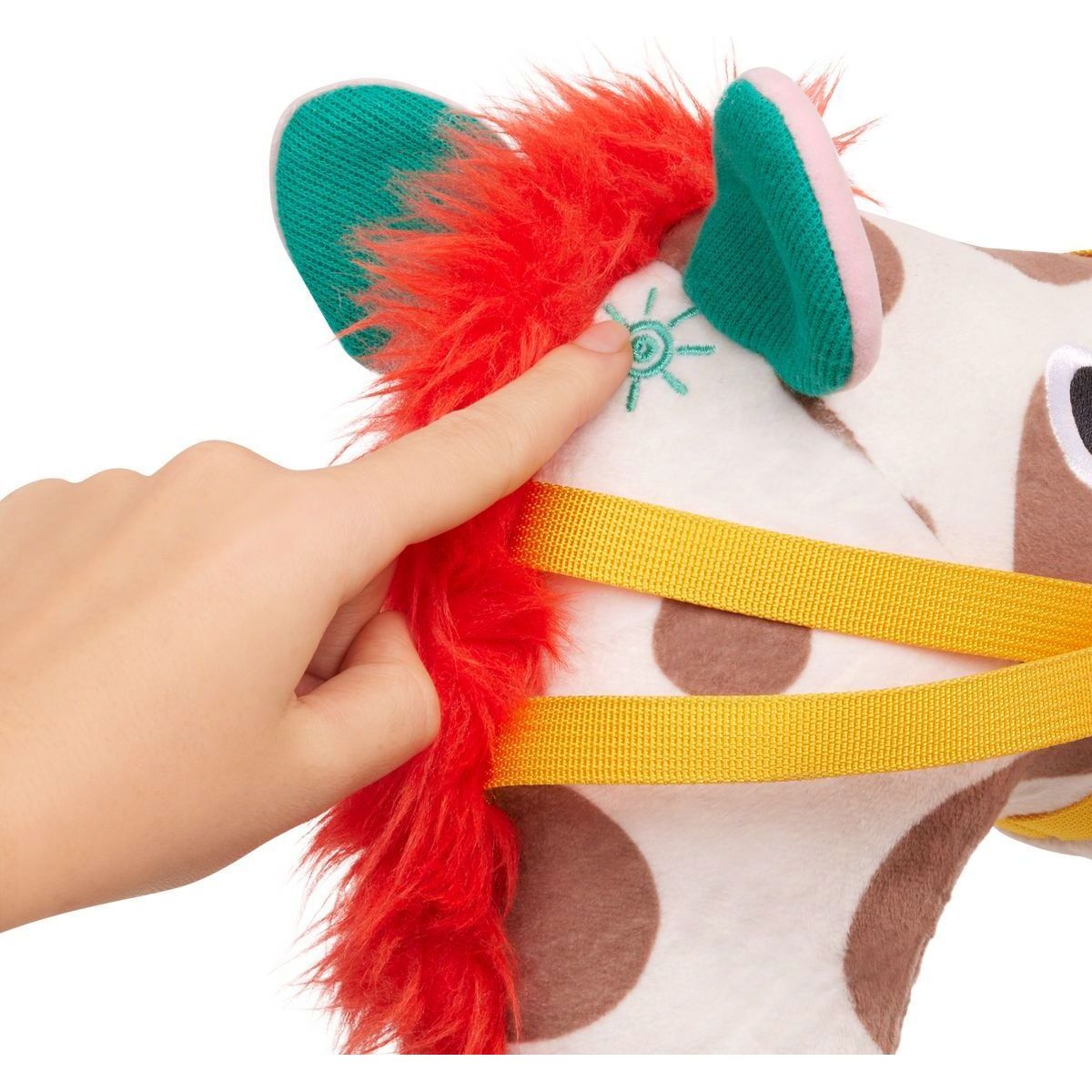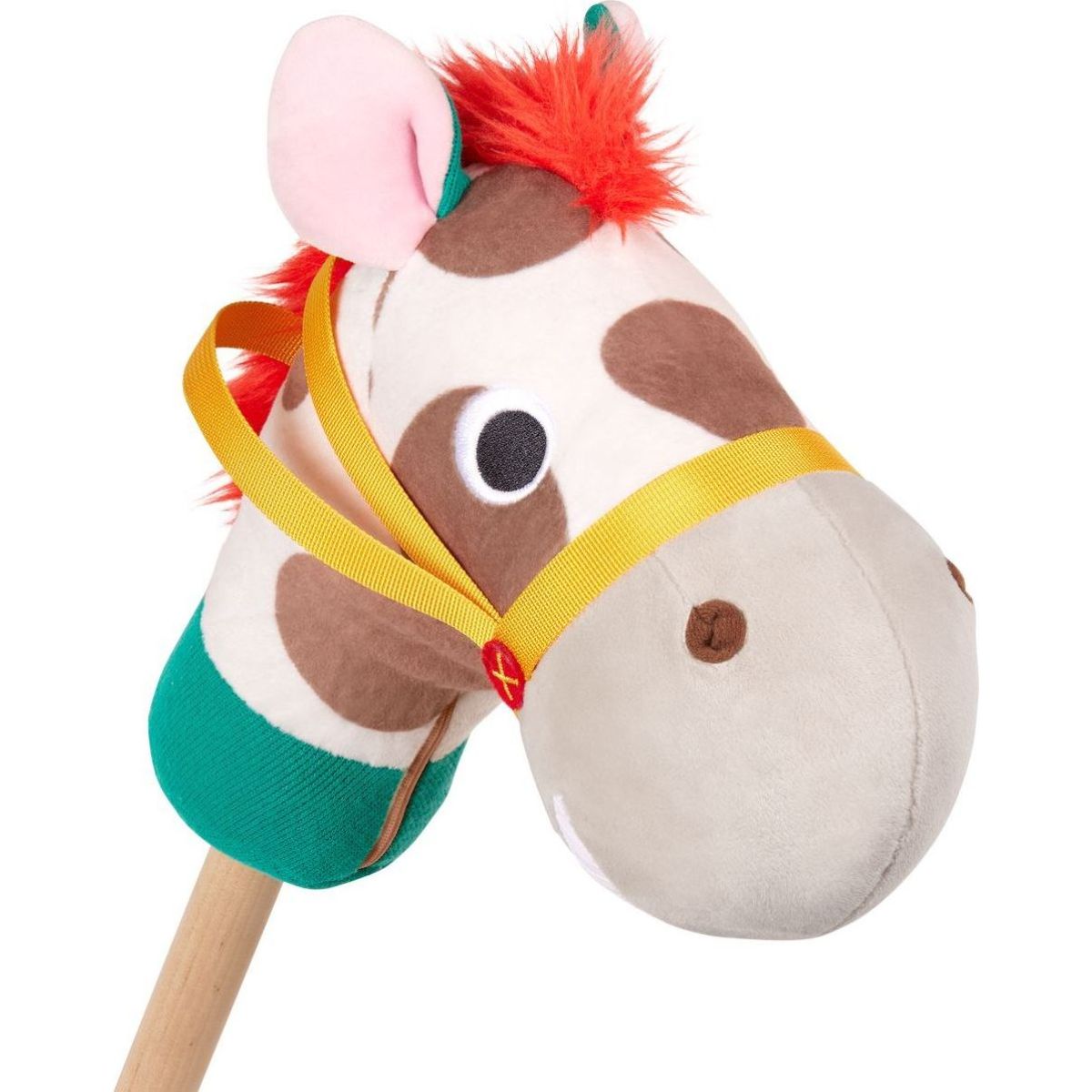Plyšový koník má hebkou hlavu z různých senzorických materiálů a tlačítko, které vydává realistické zvuky klapotu kopyt a koňského řehtání. Díky pogumované spodní části nezanechává škrábance na podlaze. Hračka pomáhá rozvíjet hrubou motoriku a koordinaci pohybů.