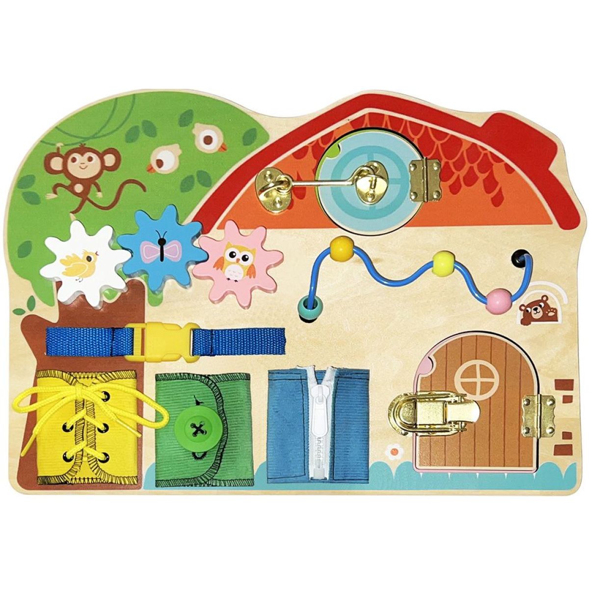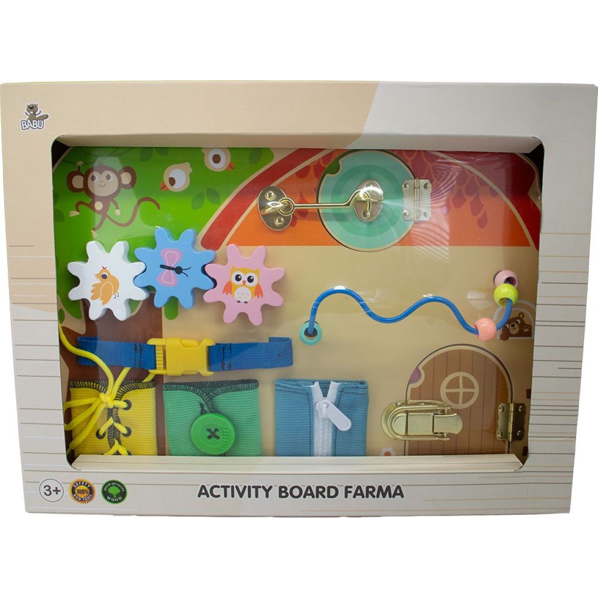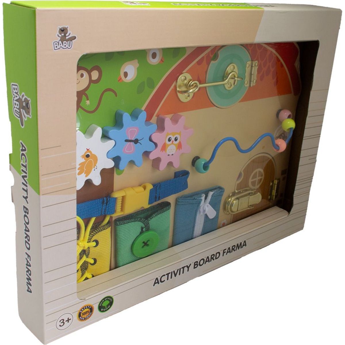 Babu Activity board Farma zve děti na hravé objevování světa farmy. Otáčením, posouváním a otevíráním jednotlivých prvků si procvičují prstíky, trénují soustředění a učí se, jak věci fungují.