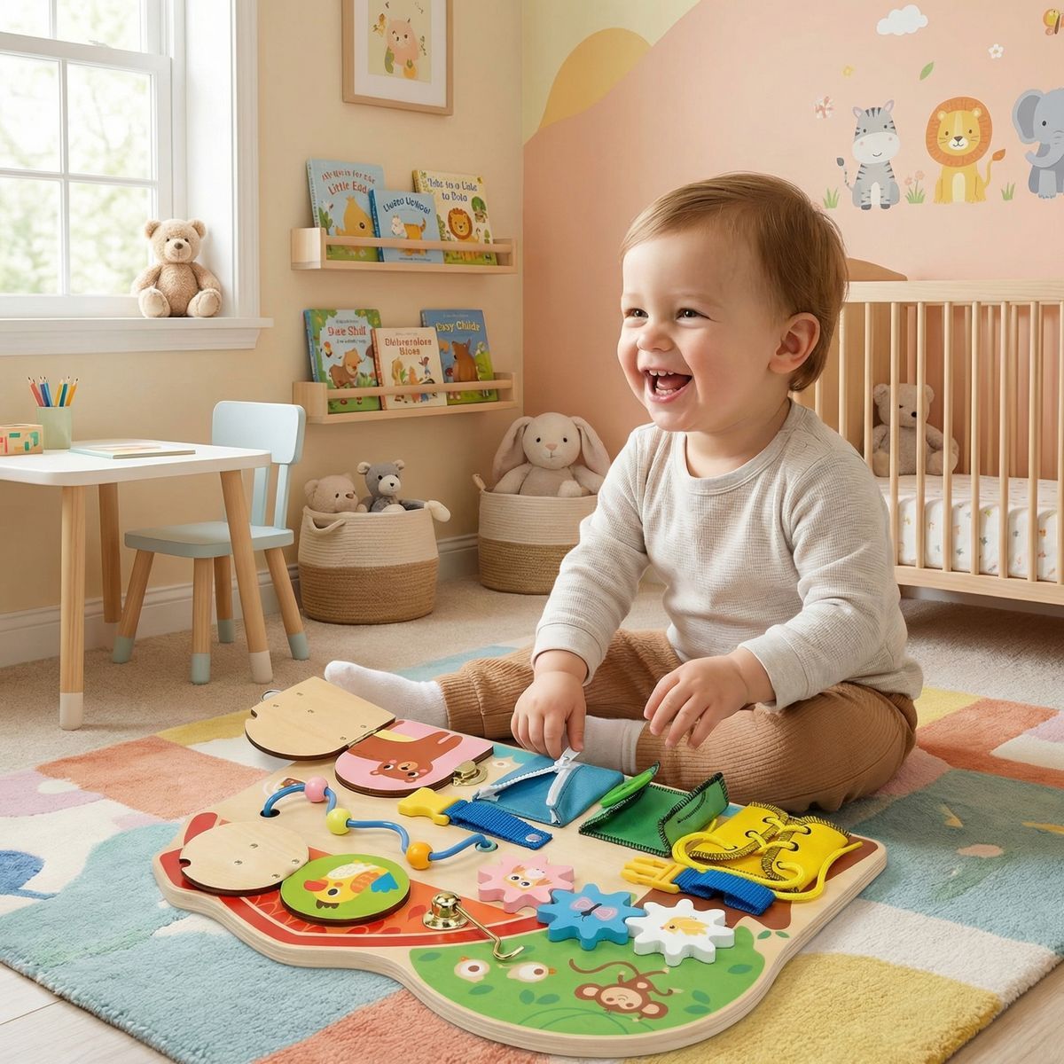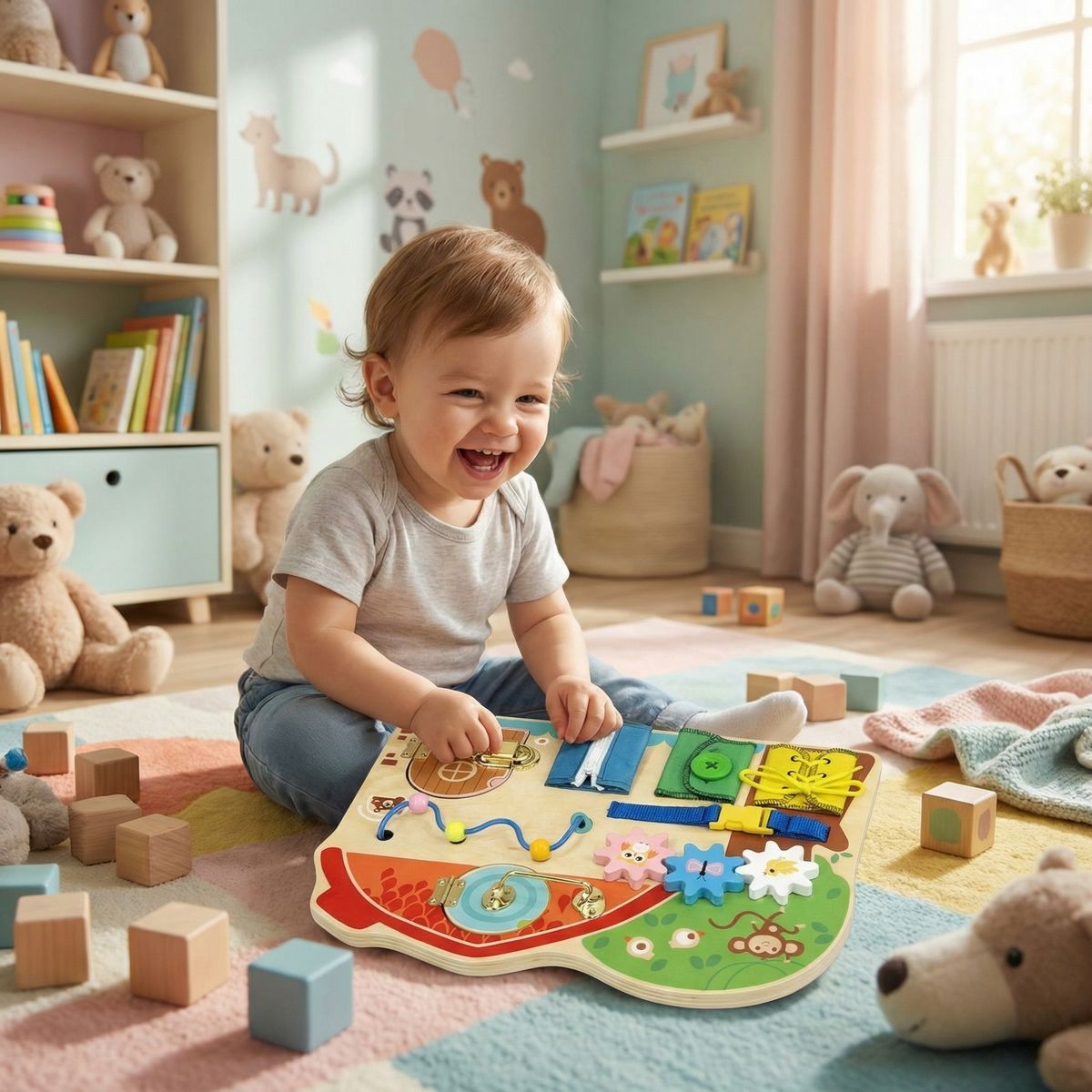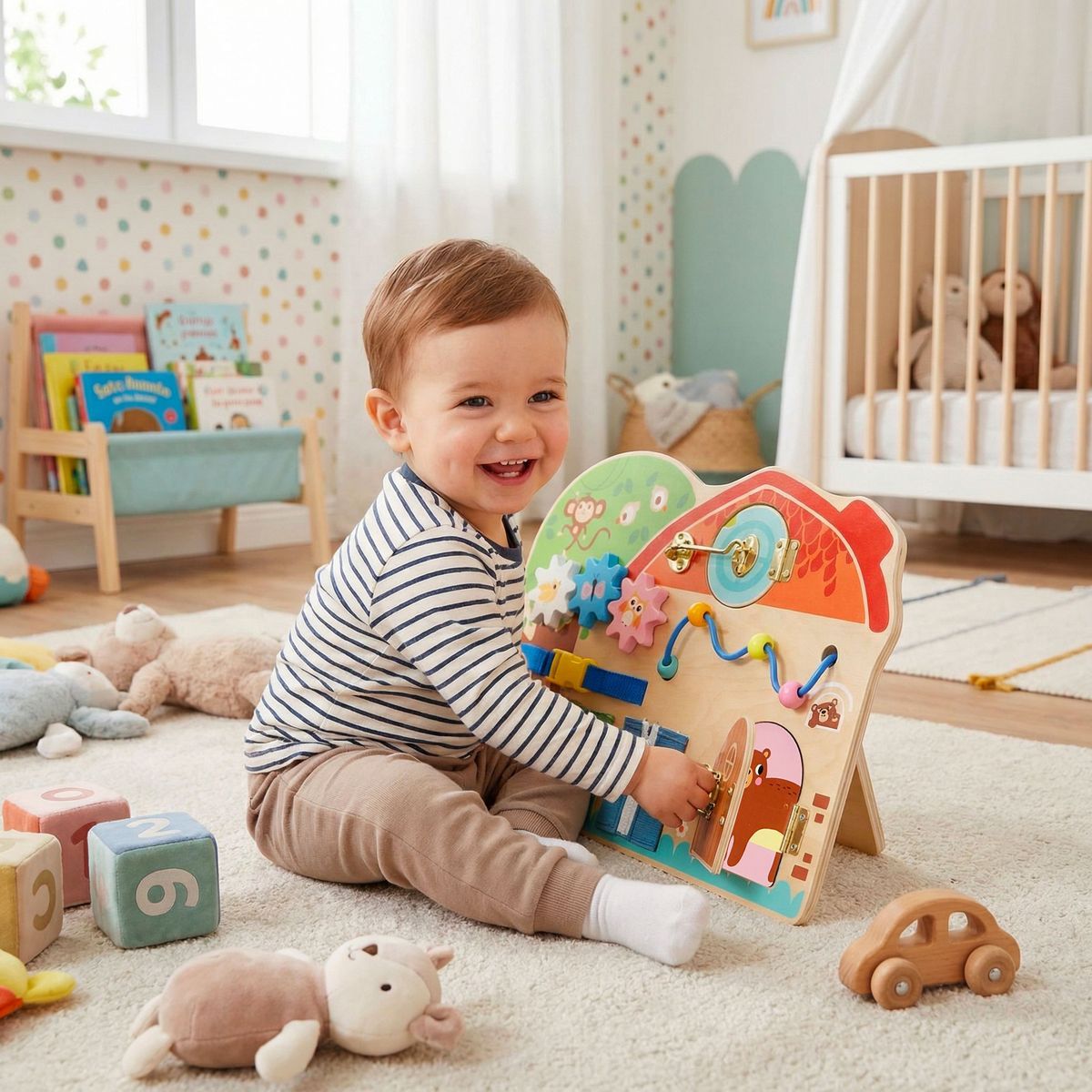Babu Activity board Farma zve děti na hravé objevování světa farmy. Otáčením, posouváním a otevíráním jednotlivých prvků si procvičují prstíky, trénují soustředění a učí se, jak věci fungují.