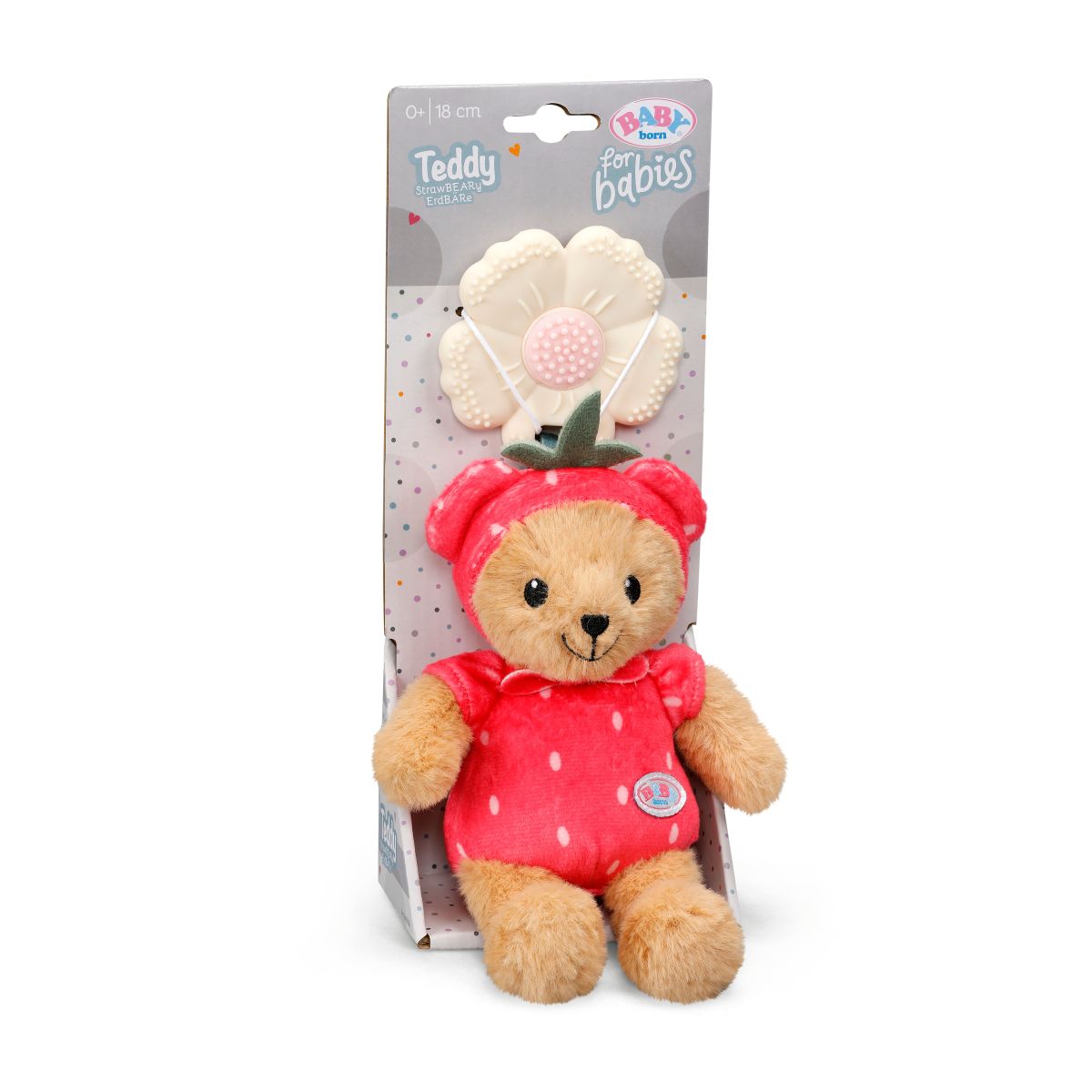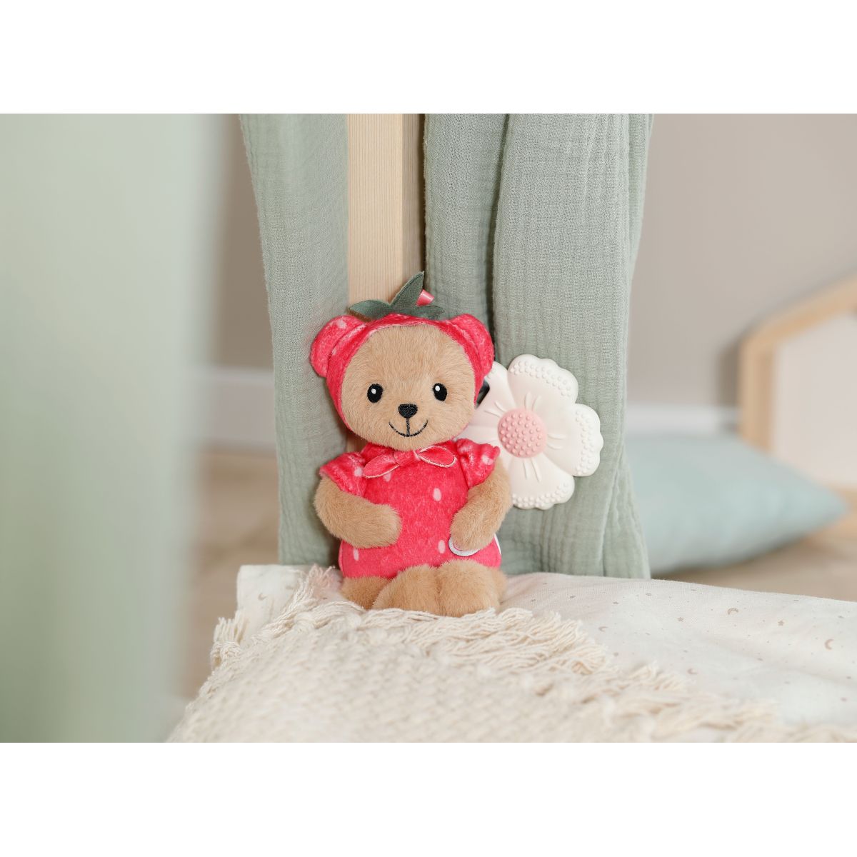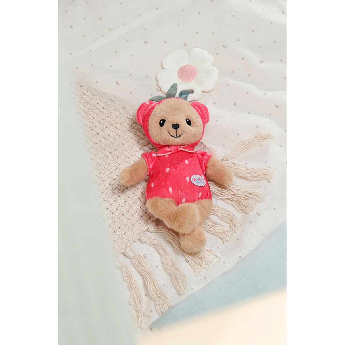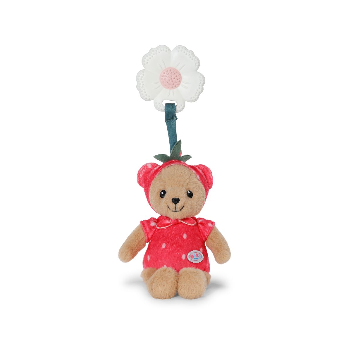 Malý medvídek Teddy oblečený jako sladká jahůdka je skvělým kamarádem pro vaše nejmenší.