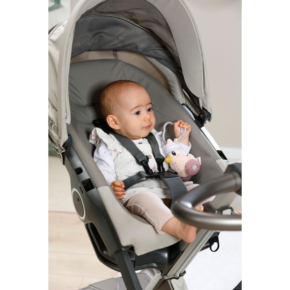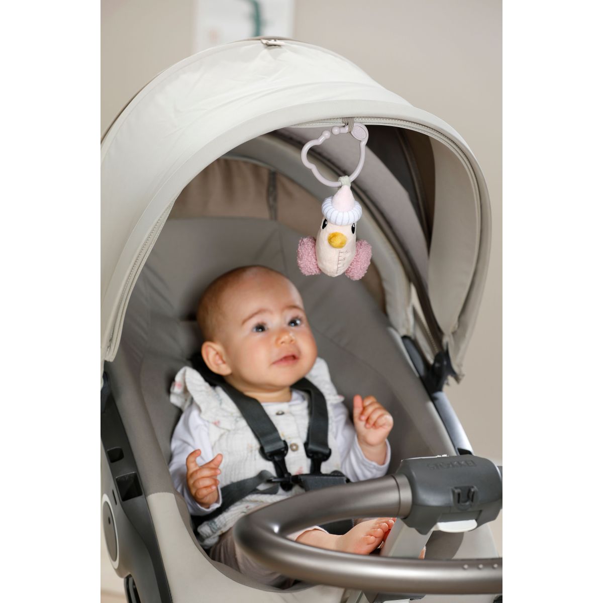 Klip umožňuje snadné přichycení k oblečení nebo kočárku, takže hračka bude stále po ruce.
