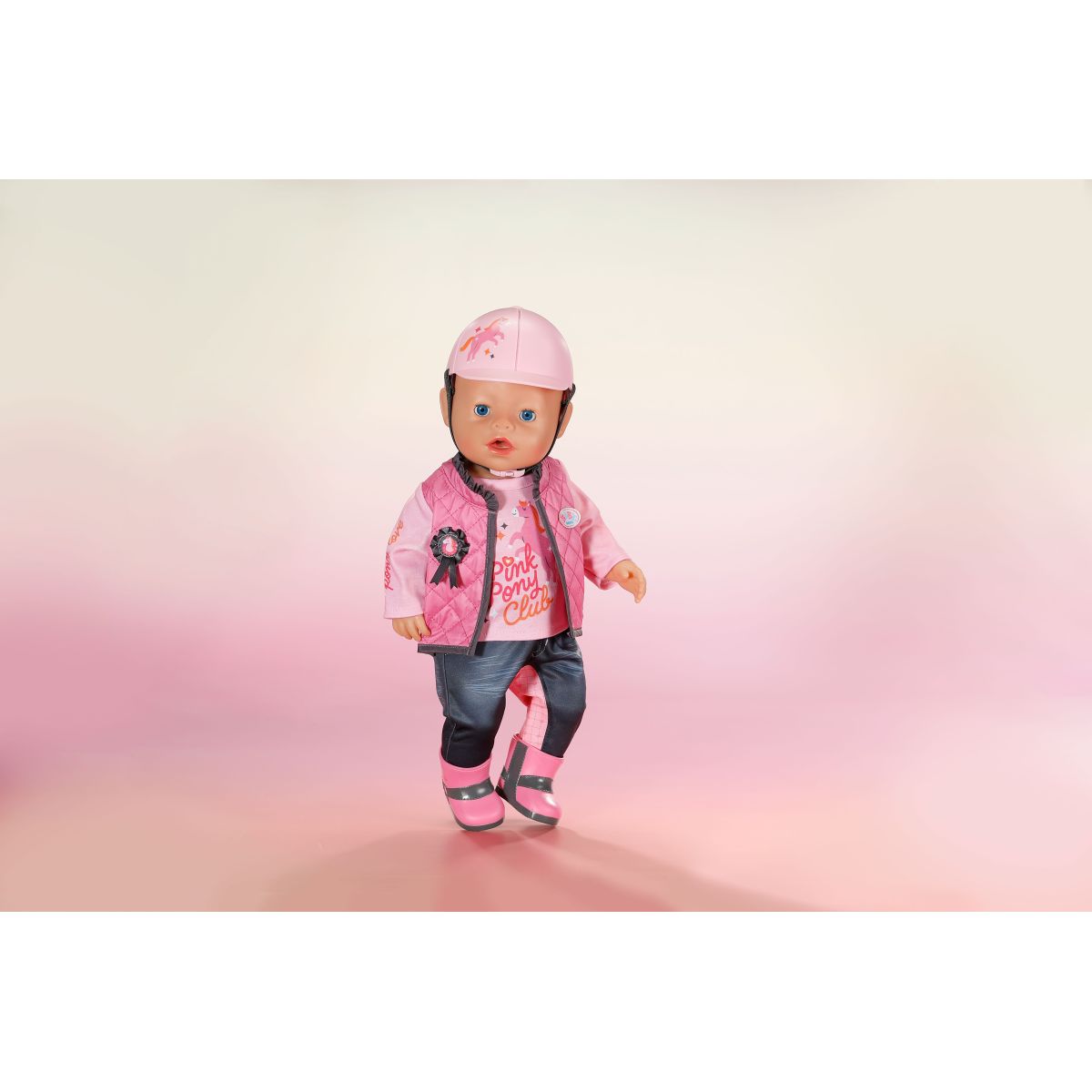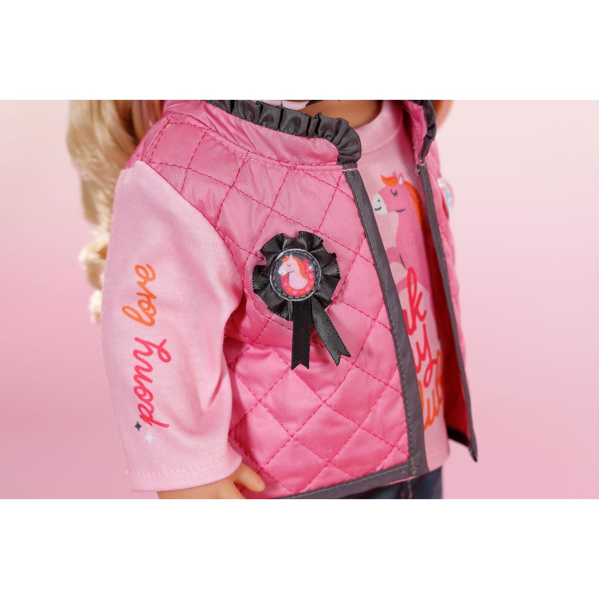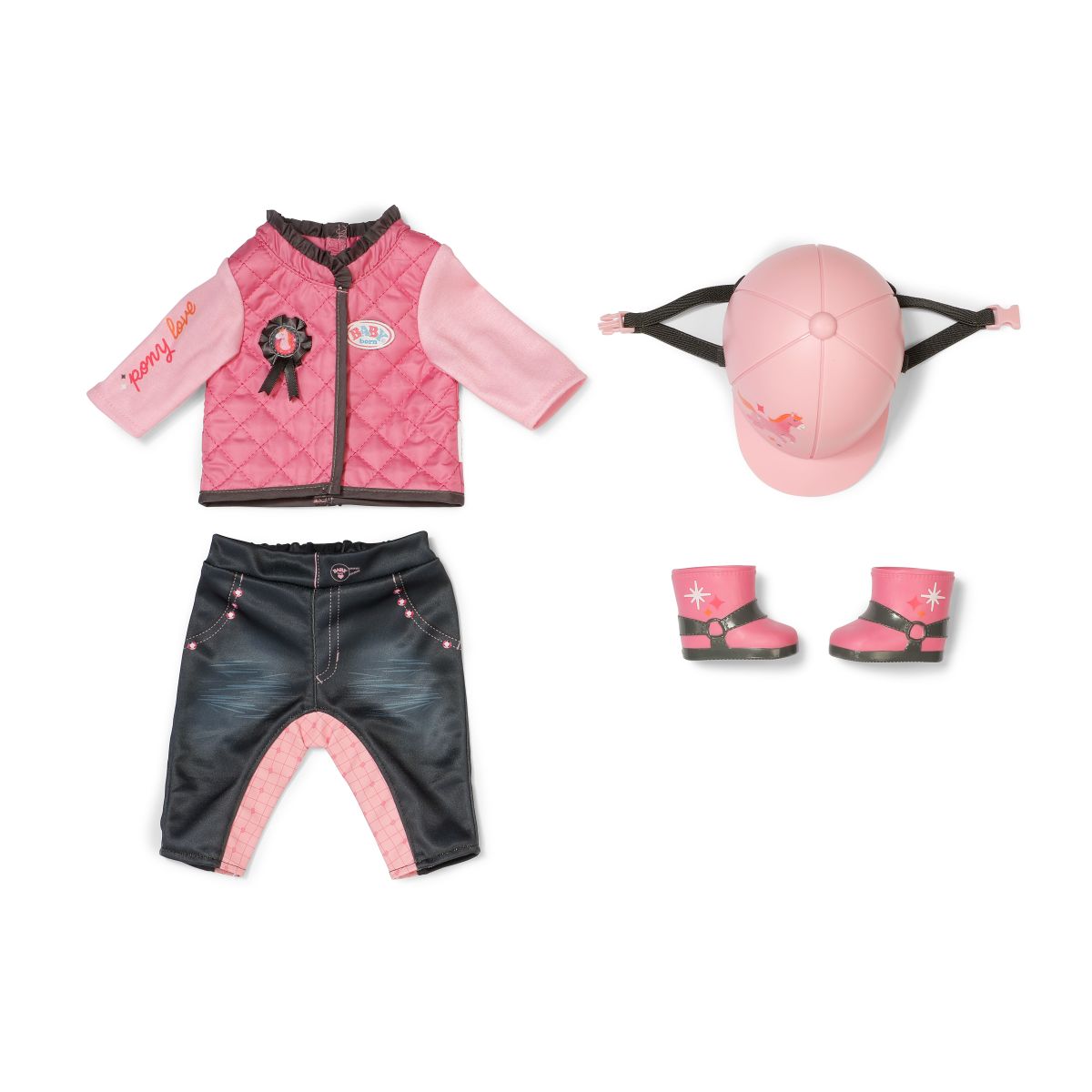 Jezdecká souprava pro panenky BABY born ve stylové růžovo-šedé kombinaci přináší spoustu zábavy všem malým jezdkyním.