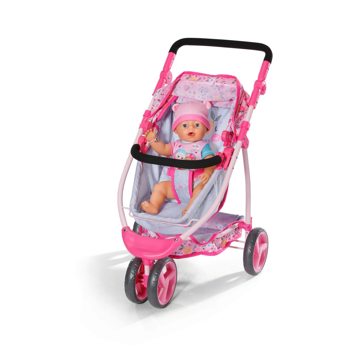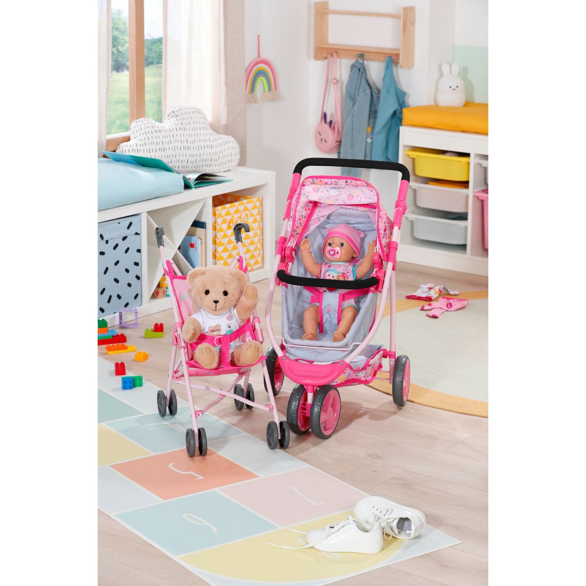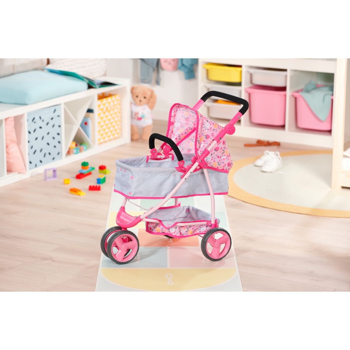 BABY born Kombinovaný kočárek je jako dva v jednom – hluboký i sportovní. Stačí sklopit korbičku a panenka rázem místo ležení sedí a může pozorovat svět kolem sebe. Polohovatelná stříška chrání před sluncem a do velkého košíku se vejde jak plyšový kamarád, tak všechny poklady z procházky.