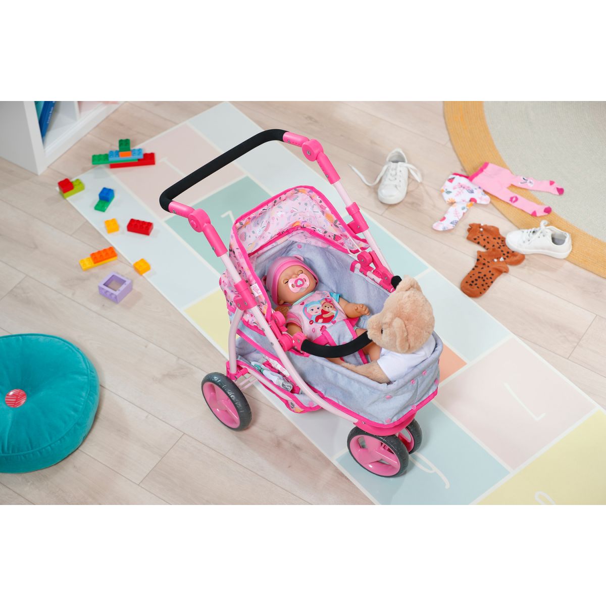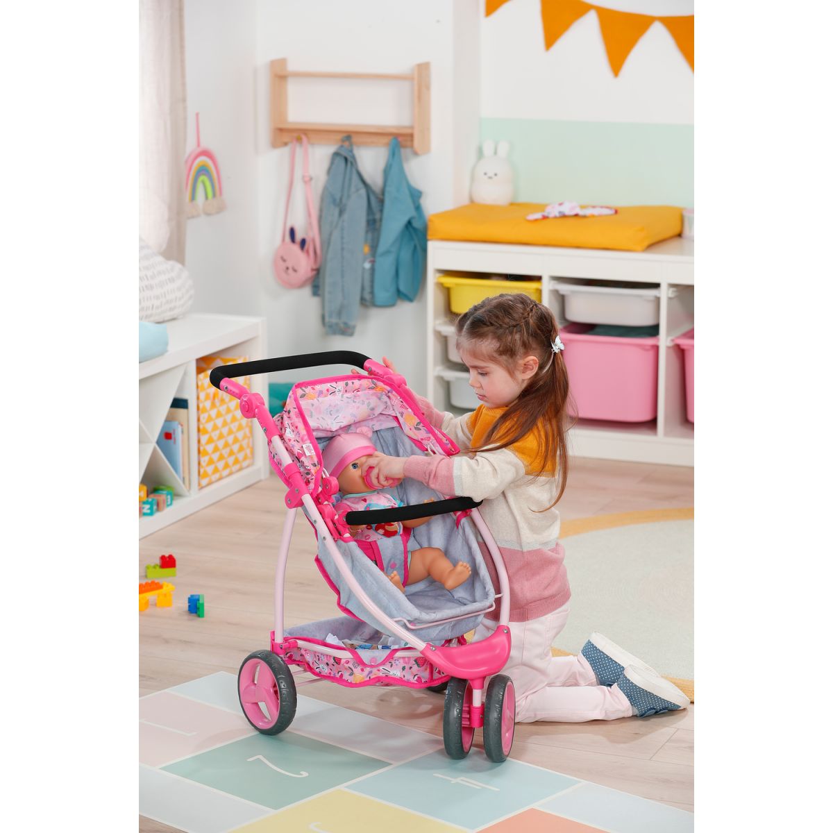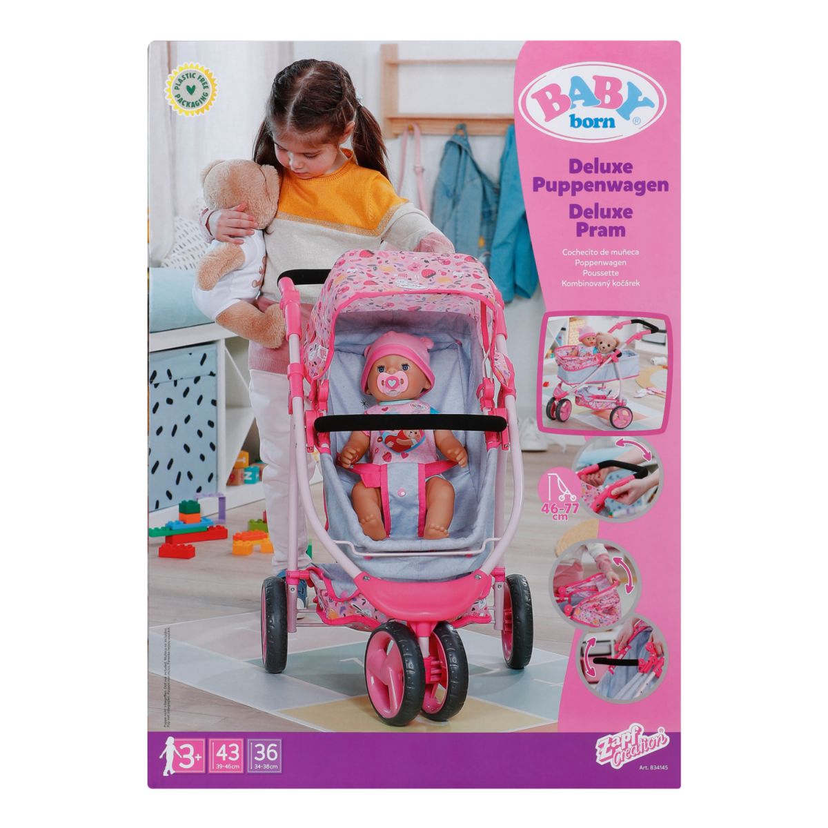 BABY born Kombinovaný kočárek je jako dva v jednom – hluboký i sportovní. Stačí sklopit korbičku a panenka rázem místo ležení sedí a může pozorovat svět kolem sebe. Polohovatelná stříška chrání před sluncem a do velkého košíku se vejde jak plyšový kamarád, tak všechny poklady z procházky.