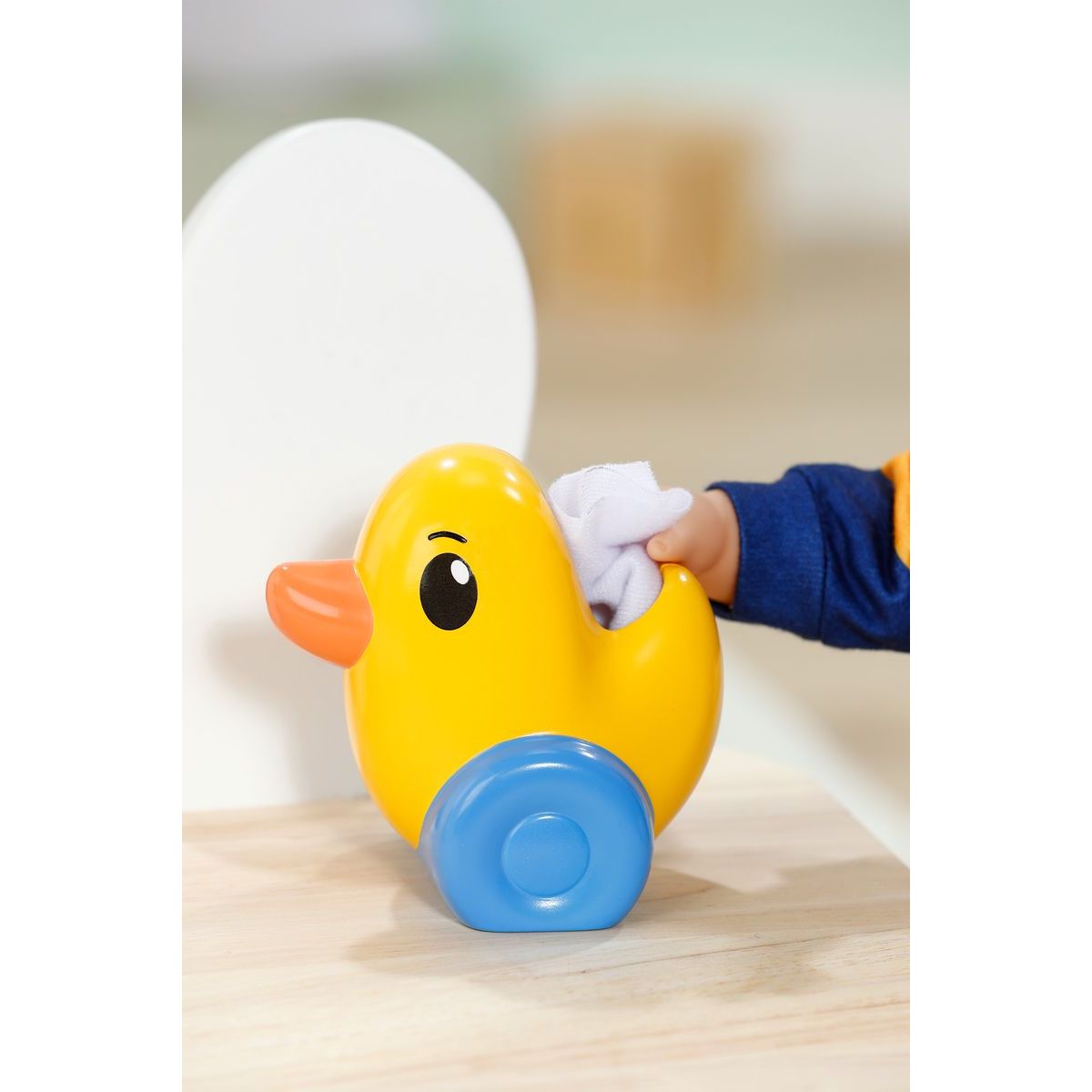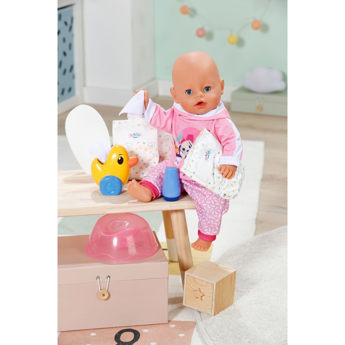 Součástí jsou tři plenky, nočník, dóza s krémem a veselý dávkovač papíru ve tvaru kačenky Berty – vše navrženo tak, aby podpořilo hygienické návyky během hry.