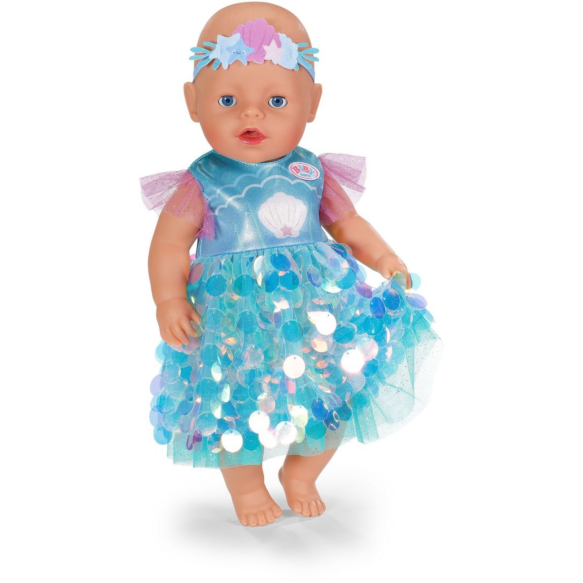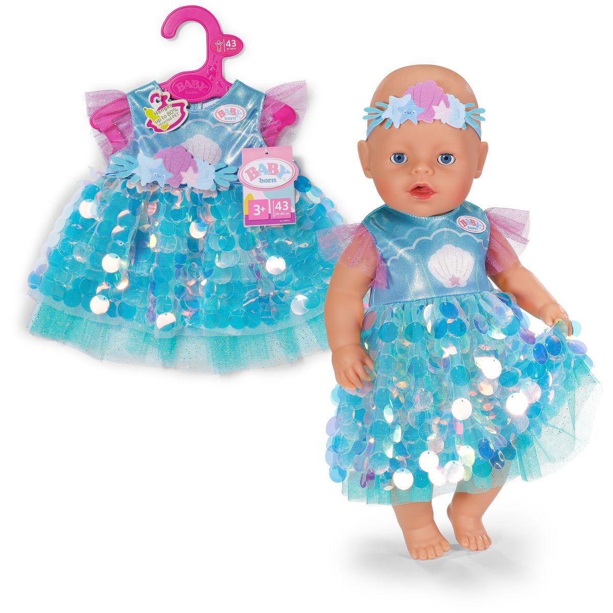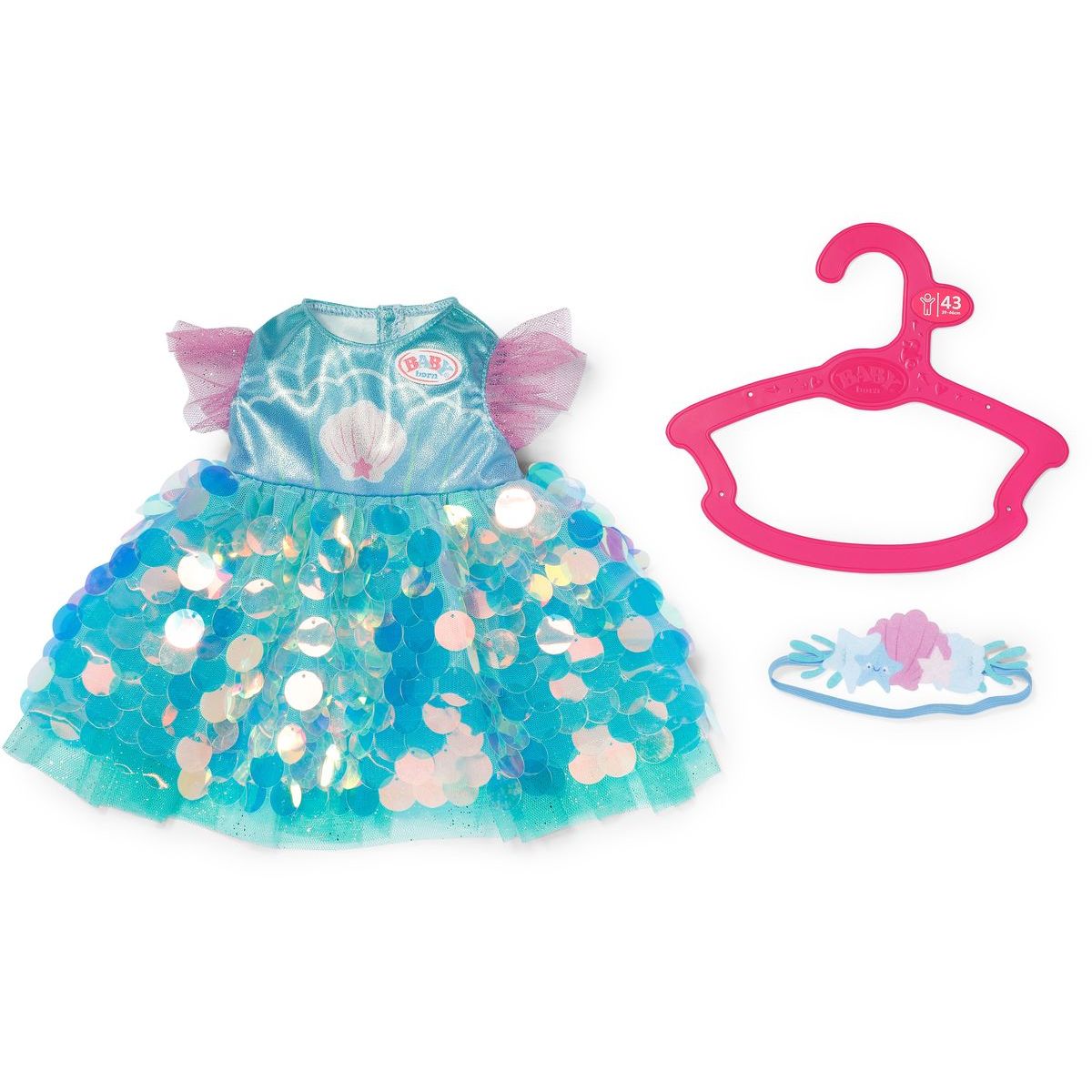 S BABY born šatičkami mořské panny mohou děti zažít kouzelné chvíle plné lesku a fantazie. Třpytivé flitrové šaty a čelenka s mušličkami promění panenku ve skutečnou mořskou vílu, která čeká na nová dobrodružství pod hladinou. Tento kostým je vhodný pro panenky o velikosti 43 cm i pro malé medvídky BABY born, takže radost z hry může být ještě větší.