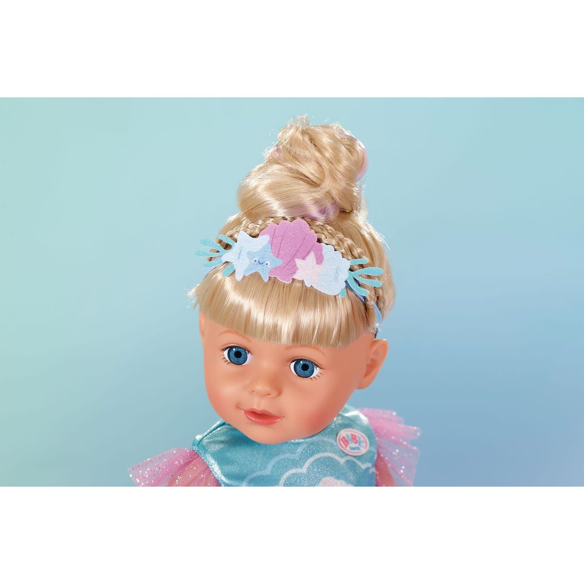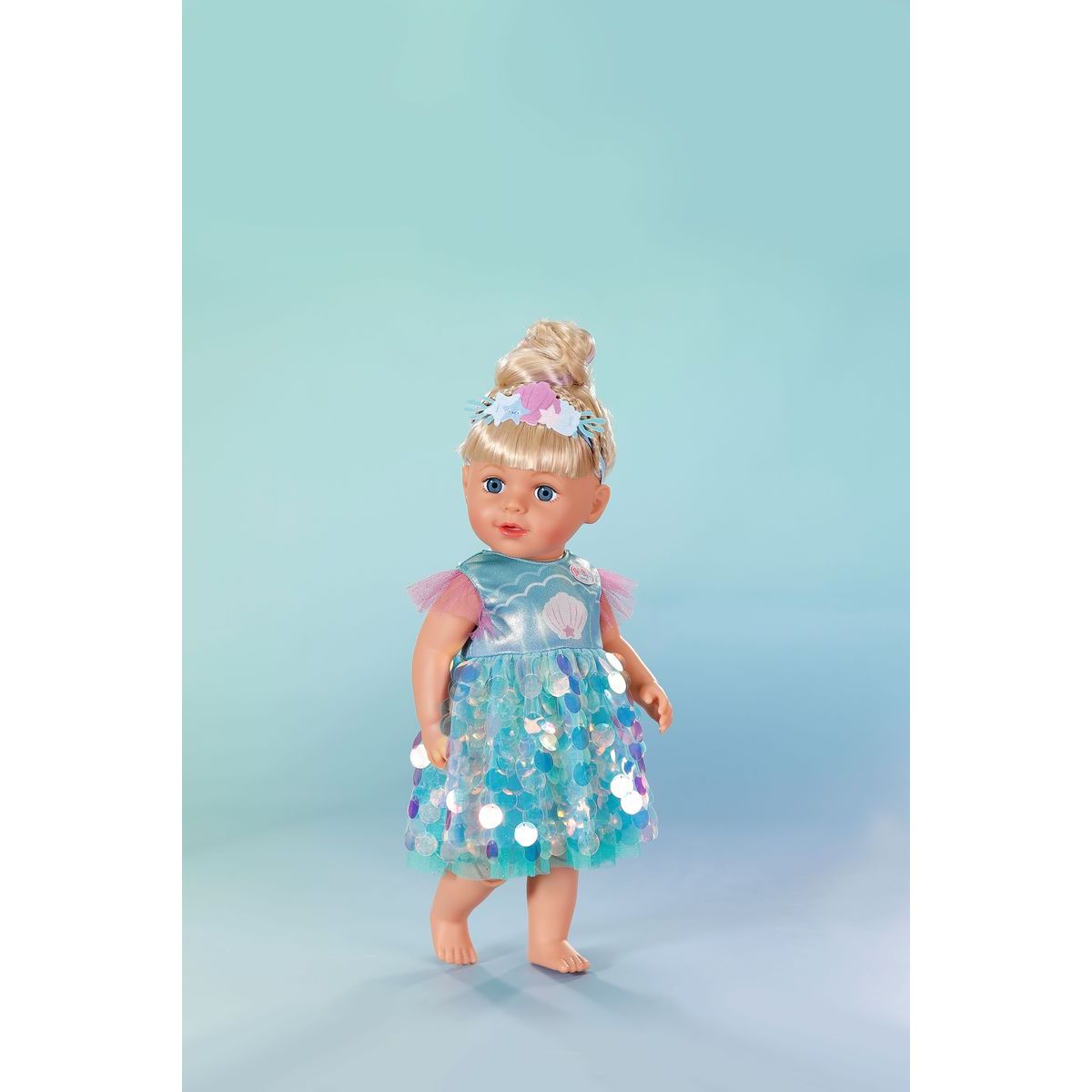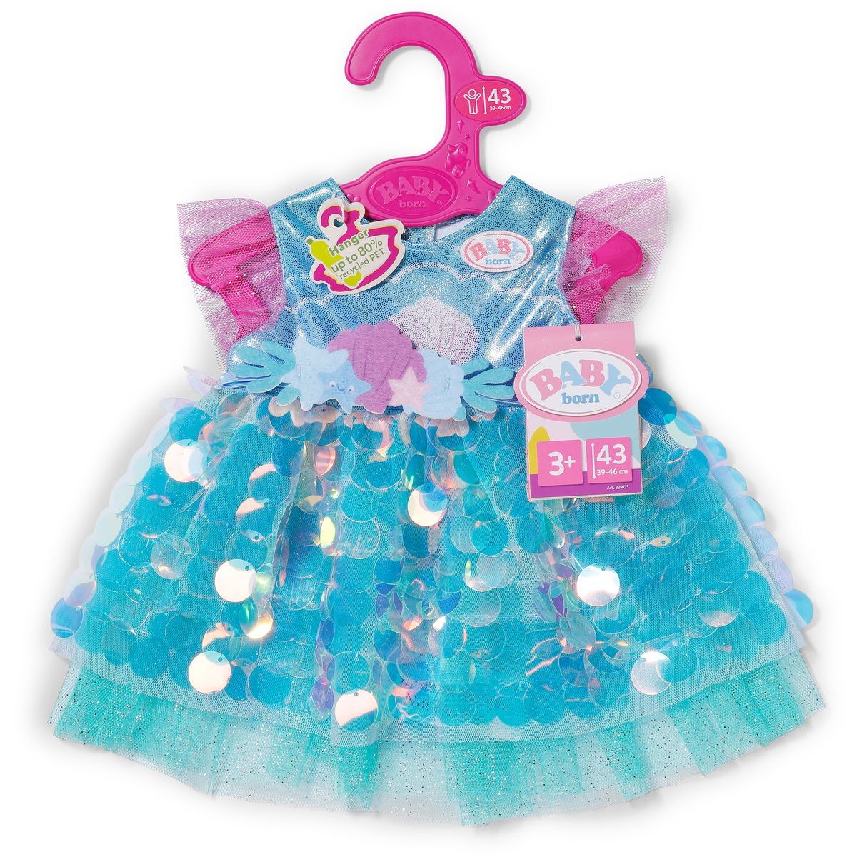 S BABY born šatičkami mořské panny mohou děti zažít kouzelné chvíle plné lesku a fantazie. Třpytivé flitrové šaty a čelenka s mušličkami promění panenku ve skutečnou mořskou vílu, která čeká na nová dobrodružství pod hladinou. Tento kostým je vhodný pro panenky o velikosti 43 cm i pro malé medvídky BABY born, takže radost z hry může být ještě větší.