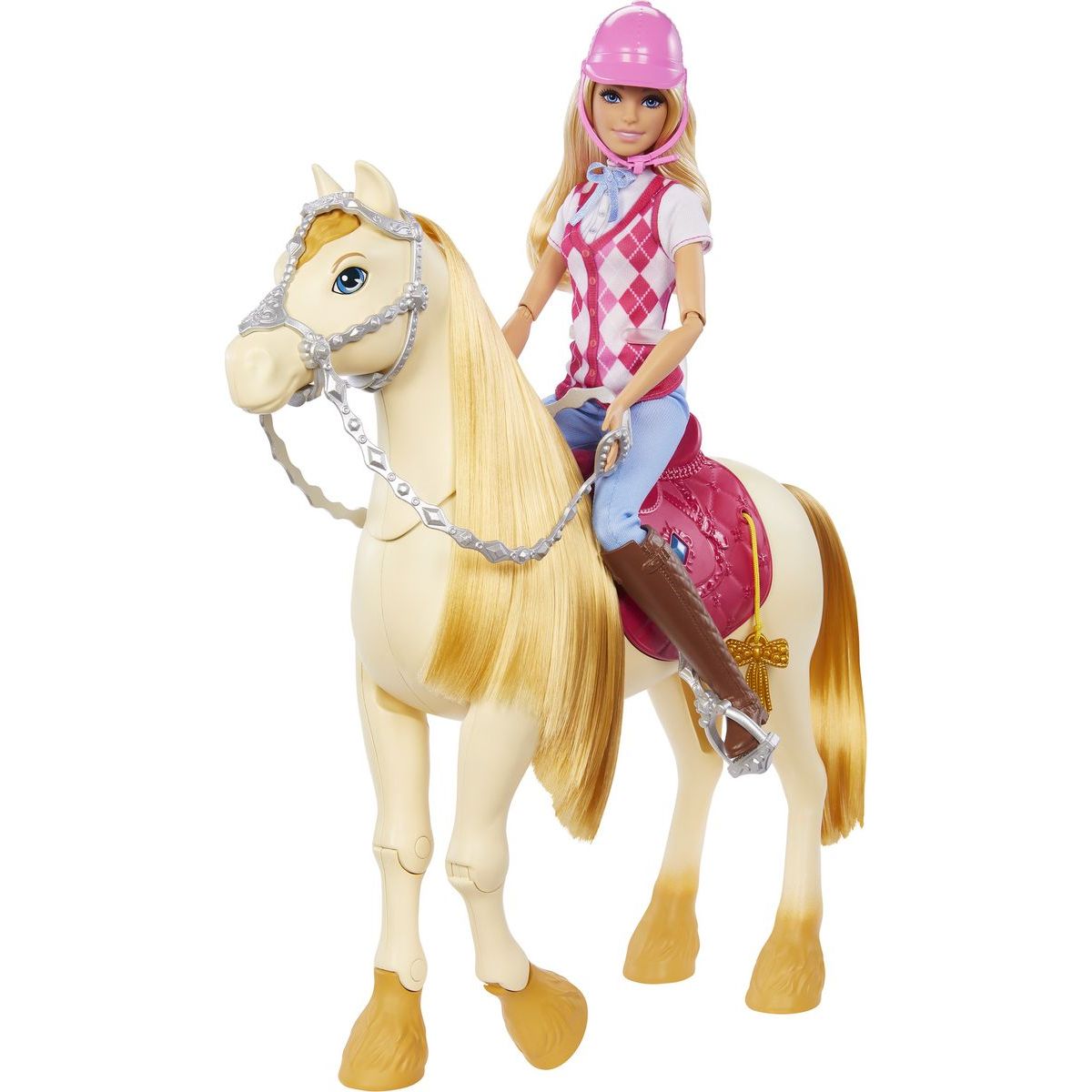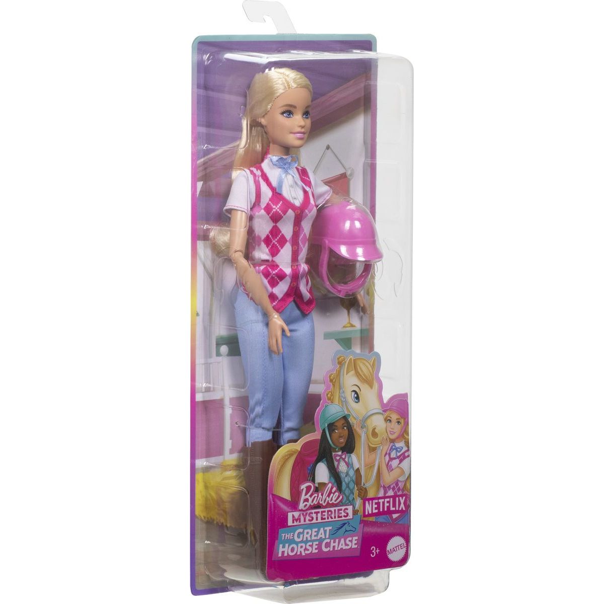 Panenka je oblečena ve svém stylovém jezdeckém oblečku, obuta ve vysokých jezdeckých botách a má připravenu růžovou ochrannou přilbu. V nabídce dalších samostatných produktů čekají na panenku krásní konící.