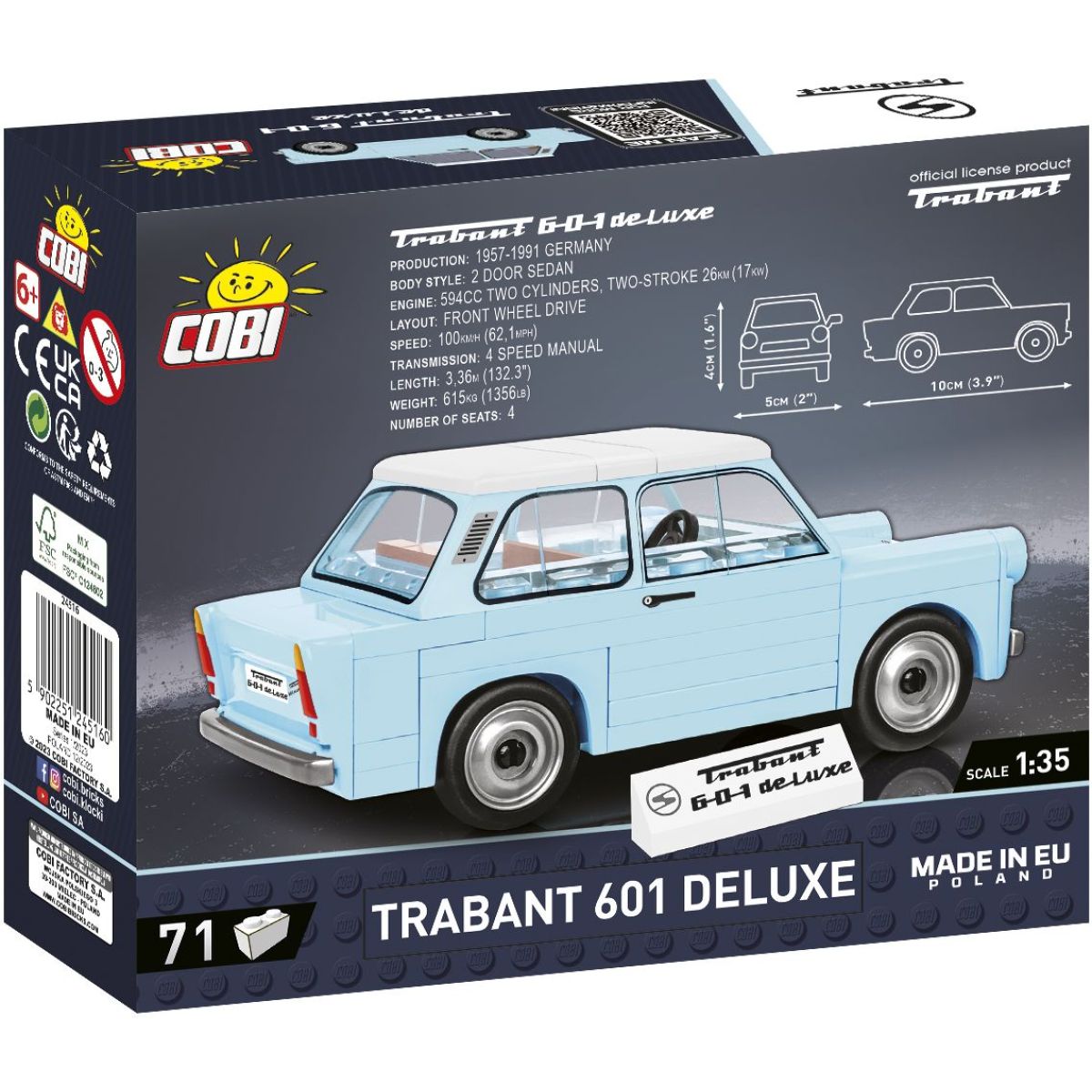 Vydejte se na cestu časem se stavebnicí Cobi Trabant 601 Deluxe! Postavte si svůj vlastní model slavného vozu z NDR, který okouzluje fanoušky už desítky let. Díky 71 kostkám zvládnou stavbu i mladší děti od šesti let a mohou tak poznat zajímavé technické řešení jako je karoserie z Duroplastu nebo malý dvoutaktní motor. Model v měřítku 1:35 je skvělým doplňkem pro každého malého stavitele i milovníka aut.