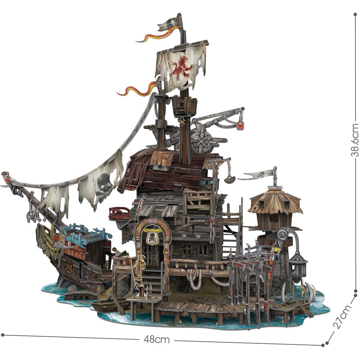 Složitost odpovídá zkušenostem starších dětí a odhadovaný čas na sestavení je kolem tří hodin. Po složení získáte krásnou dekoraci s rozměry přibližně 48 x 27 x 38 cm, která ozdobí pokoj i podpoří fantazii malých pirátů.