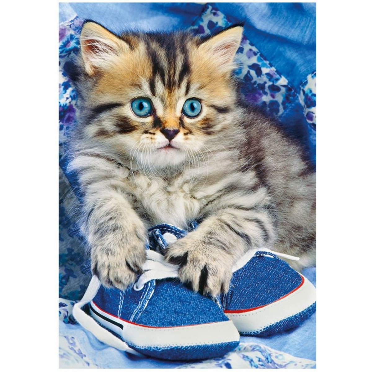 Koťátko ležící na modrých botách, je připraveno pro šikovné prstíky dětí, které si chtějí poskládat krásný obrázek a případně si ho pověsit na stěnu.