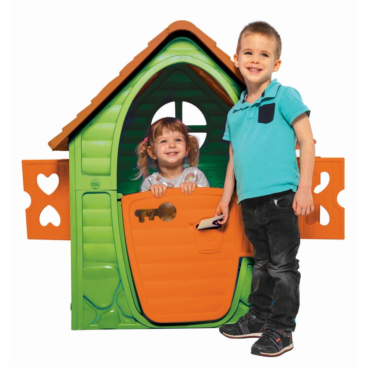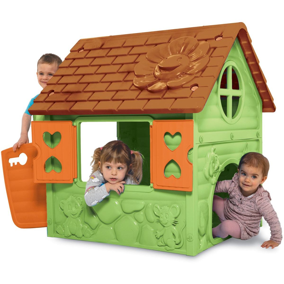 Zelené stěny, hnědá střecha, oranžové okenice a dvířka, jsou základem pro útulný prostor ke hraní. Je využitelný v interiéru i exteriéru.