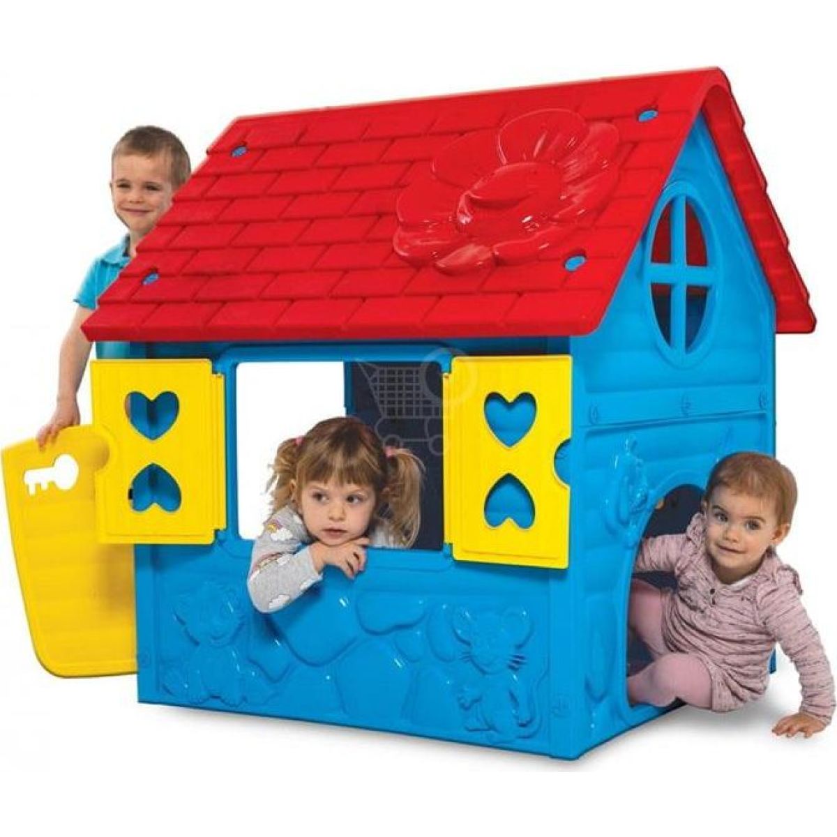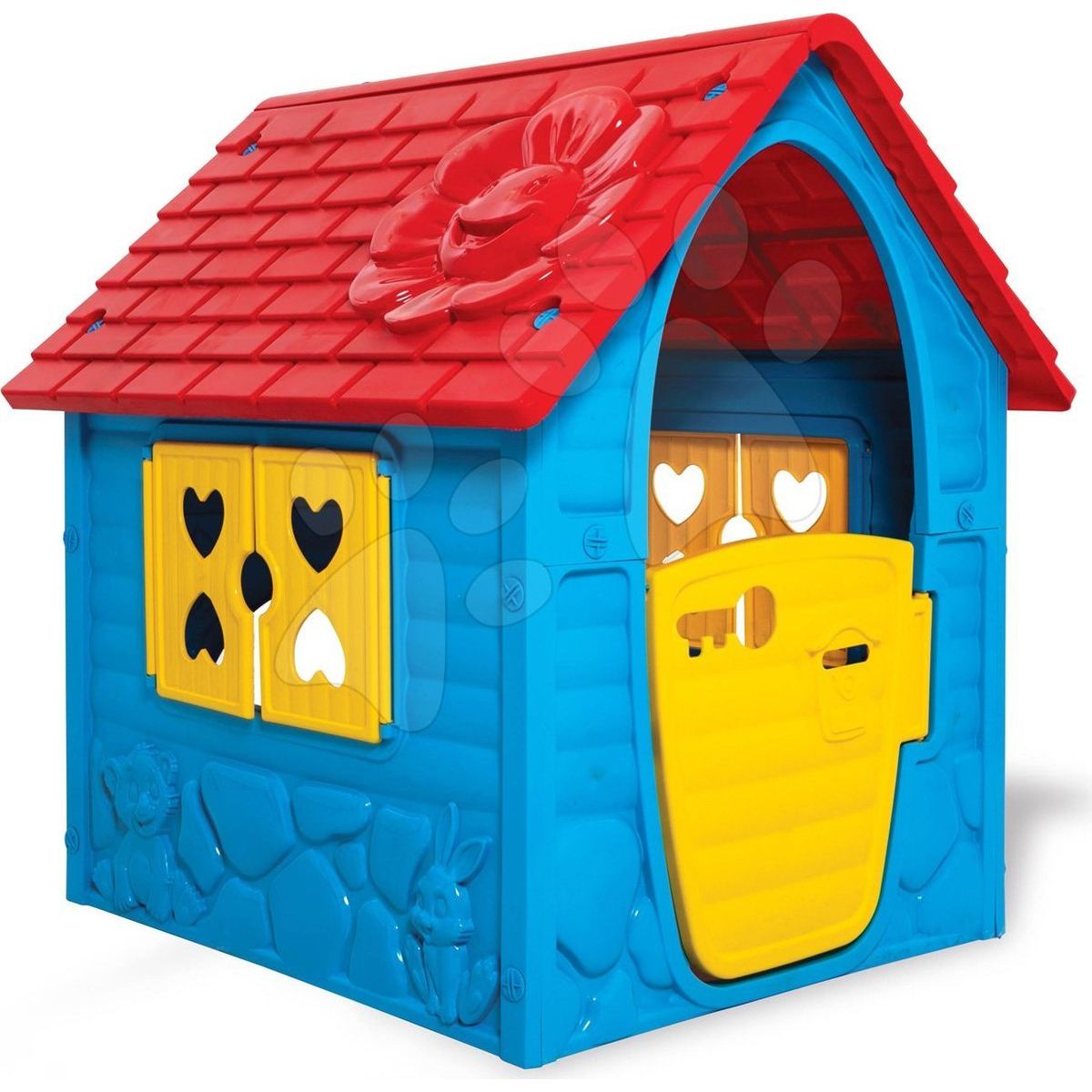 Plastové stěny jsou modré, otevíravé dveře a okenice jsou žluté barvy. Střecha je zdobena strukturální květinaou, stěny zase zvířátka.