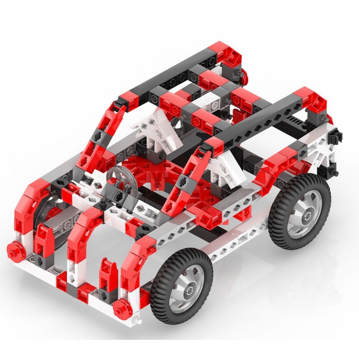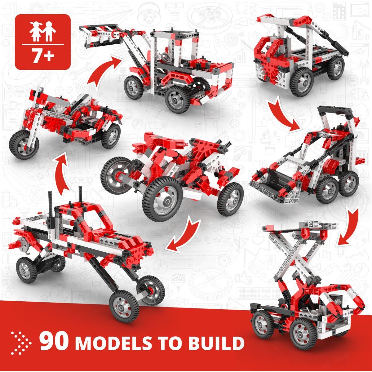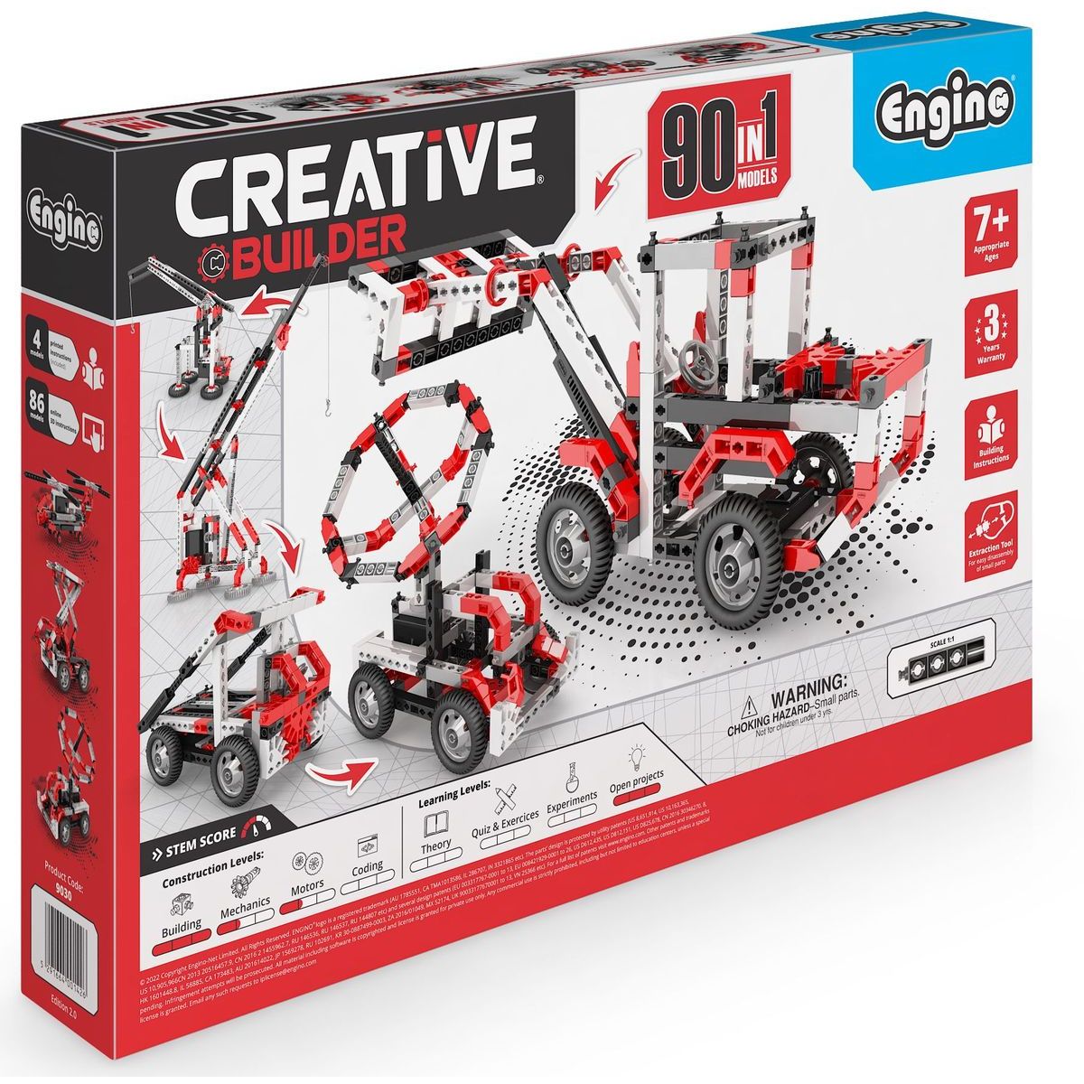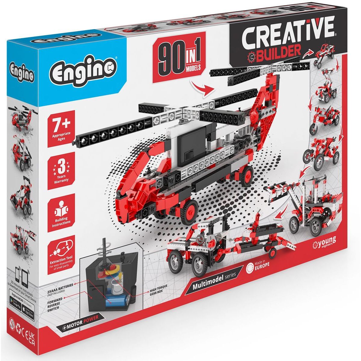 Stavebnice řady Engino Creative Builder podporují tvořivost a manuální zručnost dětí. Umožňují snadno a rychle přetvářet jeden model na druhý. Dle přiloženého návodu a mobilní aplikace krok po kroku snadno vytvoříte až 90 různých modelů. Interaktivní aplikace Engino kidCAD® zobrazí modely ve 3D, které si můžete libovolně otáčet, prohlížet a upravovat. Součástí je i motorek umožňující nastavení směru pohybu. Výrobek vyžaduje 2× AAA baterie (nejsou součástí balení). Kompatibilní s ostatními druhy stavebnic Engino. Vhodné od 7 let, vyrobeno na Kypru EU.