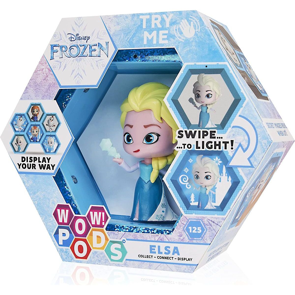 Princezna Elsa je jednou ze sběratelských postaviček Wow Pods, které si mohou děti sestavovat do různých vzorů. Hrany 3D hexagon bloků na sebe hladce navazují. Holky a kluci tak mohou sestavit nejen různé vzory, ale celé stěny. Po aktivaci infra senzoru, se sepnou světélka uvnitř rámu bloku a osvítí hrdinu s jeho specifickým výrazem.