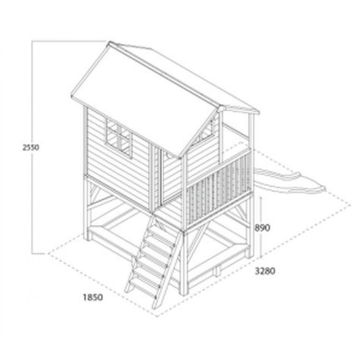 Obří dřevěný domeček na stojnách s verandou, skluzavkou a pískovištěm. Je vyroben ze suchého cedrového dřeva, které zaručuje vysokou odolnost. Ti nejmladší si mohou hrát dole na pískovišti, zatímco ti starší si hrají nahoře v domečku.