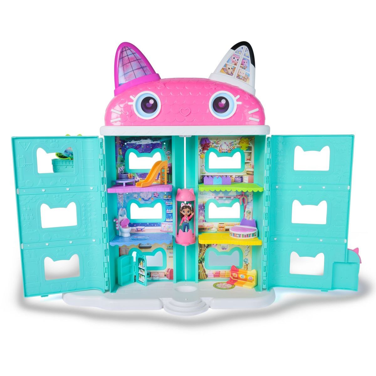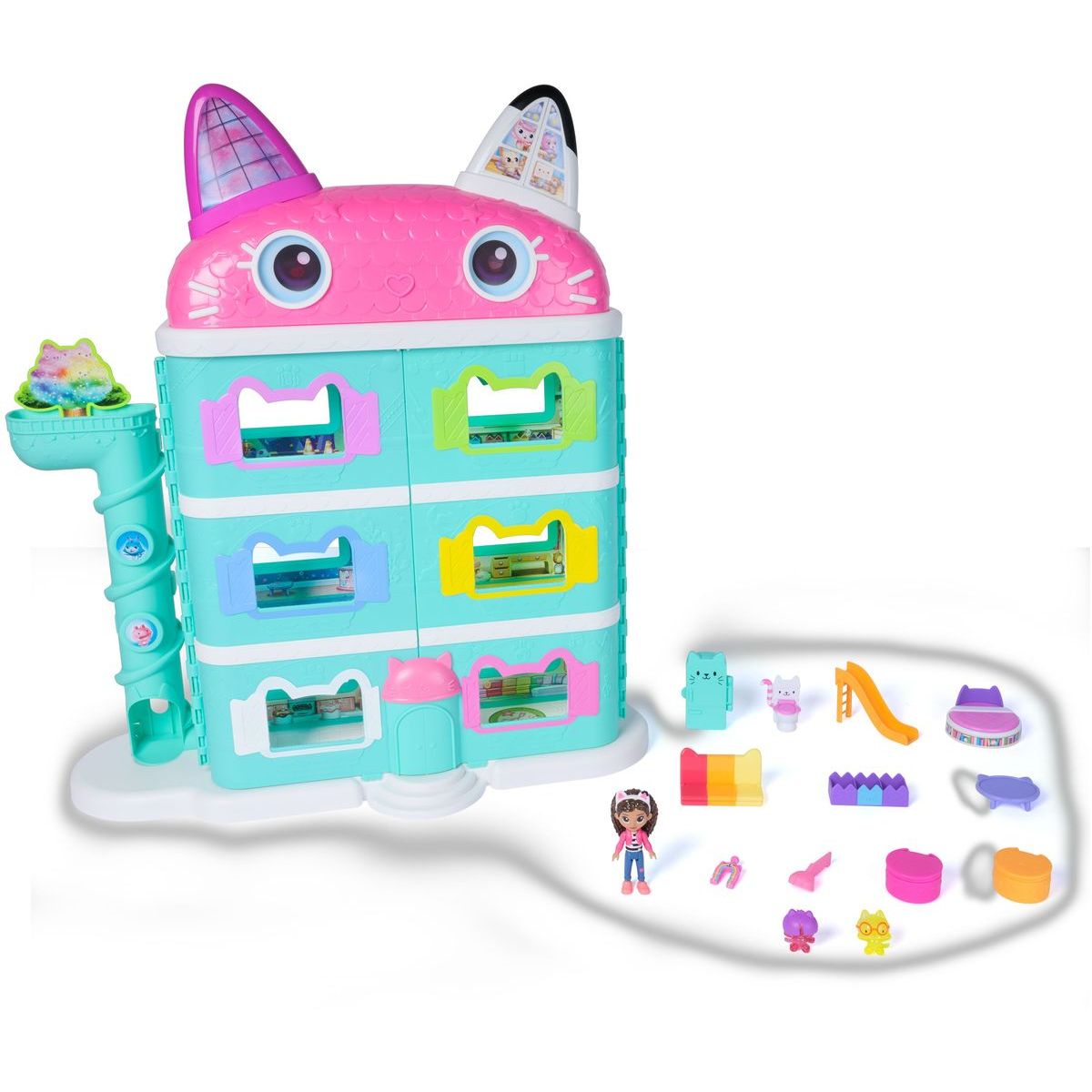 Nechybí ani 9cm figurka Gábiny s její slavnou čelenkou s kočičíma ušima – připravená na nová dobrodružství se svými mňau-kamarády. Po rozbalení balíčku objevíte doplňky k domečku a pomocí QR kódu navíc odemknete bonus v aplikaci Gábinin kouzelný domek.