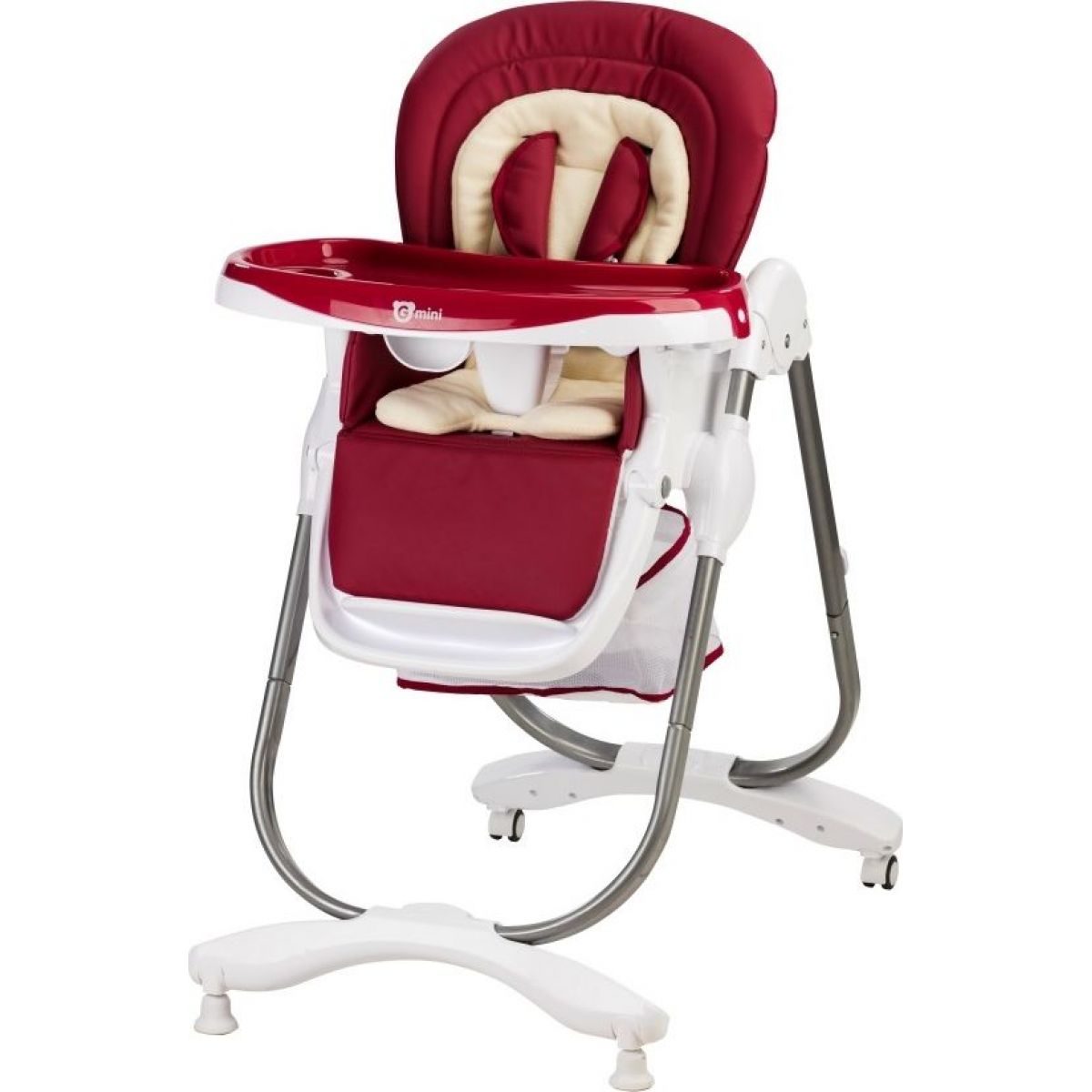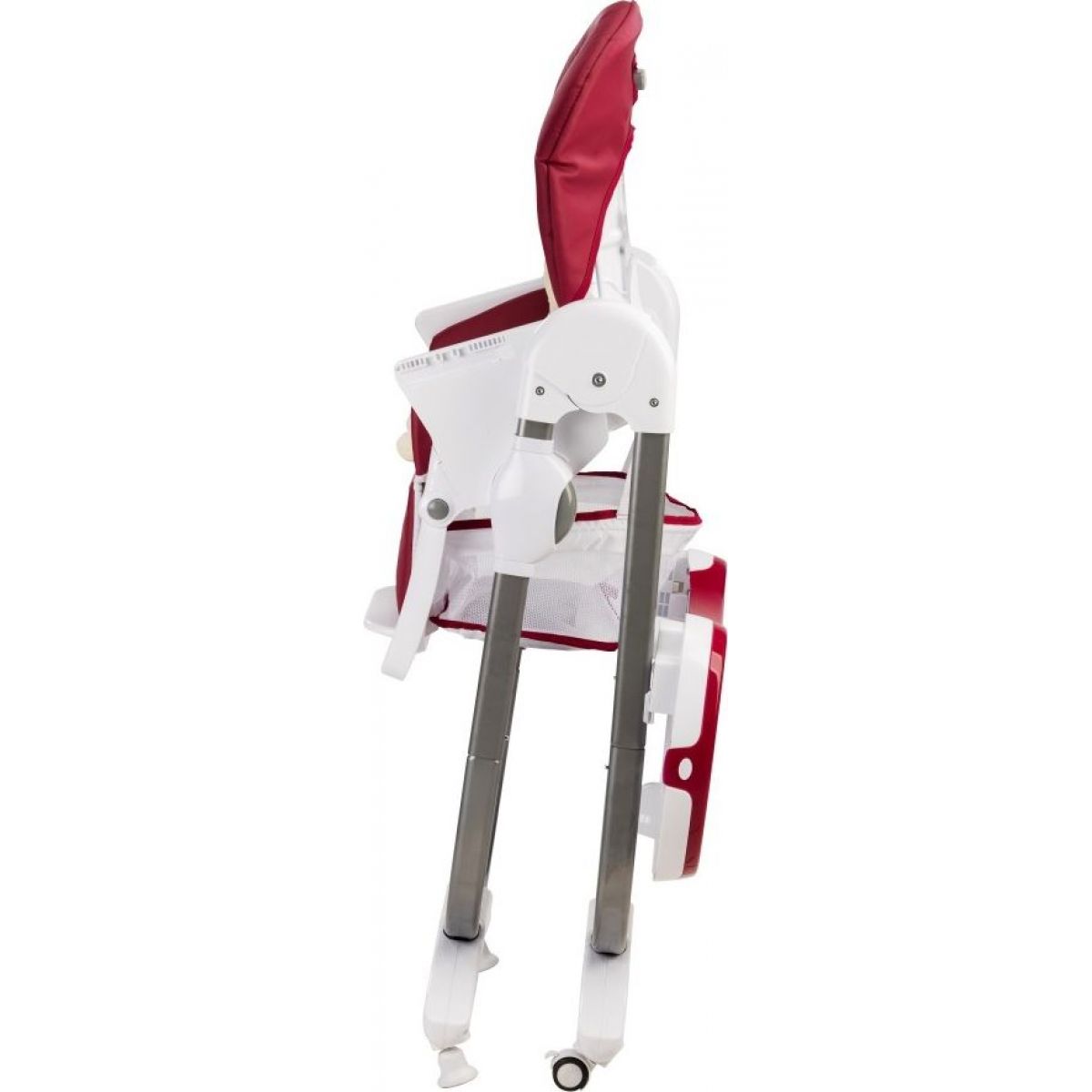Tmavě vínová jídelní židle s kovovou stabilní konstrukcí, nastavitelnou opěrkou zad a košíkem na potřebné věci je určena pro děti od půl roku. Děti mohou využít dvojitého jídelního a hracího pultíku, který jde sejmout, aby se dala židlička přisunout k jakémukoliv stolu. Pohodlné sezení jim zajišťuje přídavné polstrování. Připoutány jsou 5-ti bodovým bezpečnostním pásem. Pro snadnou manipulaci je židle opatřena kolečky.
