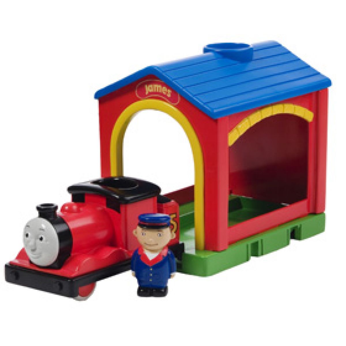 Mašinka James s depem je ideální hračka pro všechny malé inženýry. Stačí prostrčit strojvůdce komínem do kabiny lokomotivy a mašinka se poté s houkáním a s realistickými zvuky rozjede.