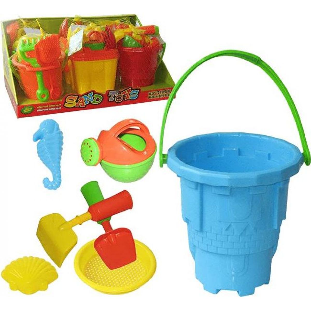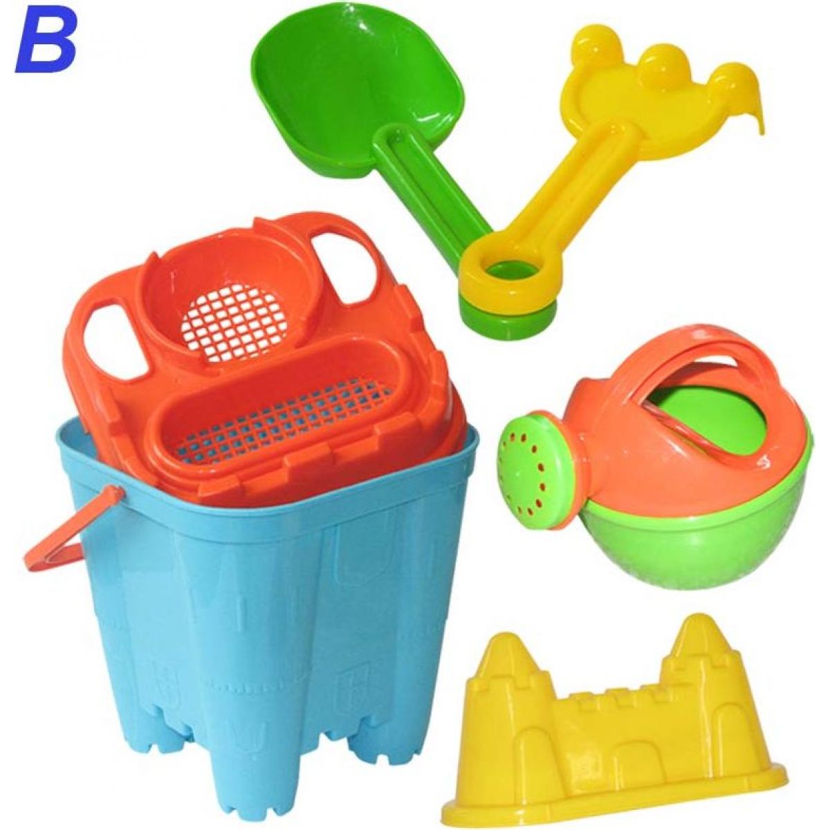 Klasická hračka na písek. Žádná zábav na pískovišti se bez něj neobejde. Ke kyblíku přidáváme bohaté příslušenství. Nechybí lopatka, hrabičky, konývka, bábovičky, ani sítko na přesýpání!