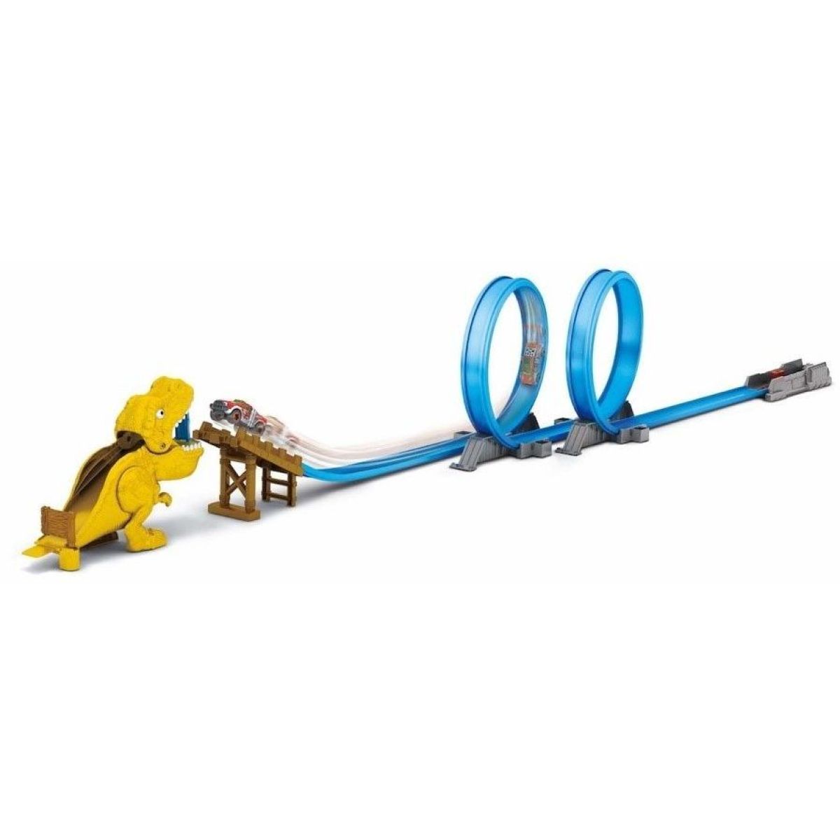 Hrací sada s dráhou, T-Rexem a kovovým autíčkem přenese děti přímo do světa akčních závodů, kde rychlost rozhoduje o vítězství. Výkonný odpalovač vystřelí kovové autíčko vstříc dráze a nebezpečné překážce v podobě T-Rexí hlavy, kterou je třeba zdolat. Sestavitelná dráha nabízí spoustu možností pro opakovanou hru a podporuje dětskou fantazii i soutěživost. Ideální herní set pro malé závodníky, kteří milují napětí a dynamickou akci.