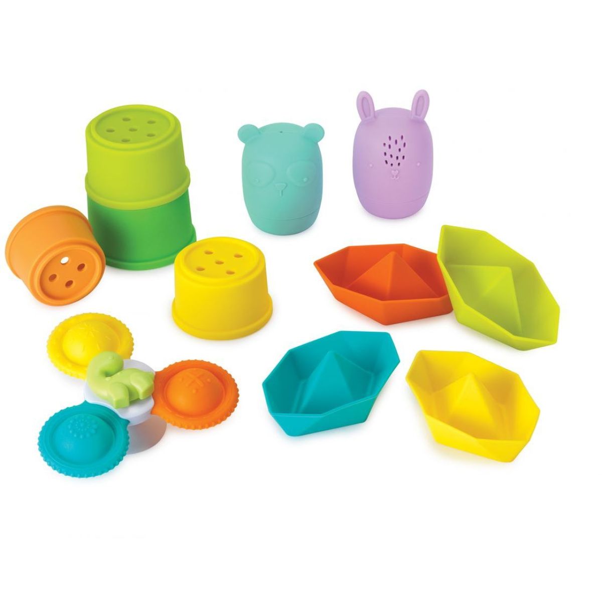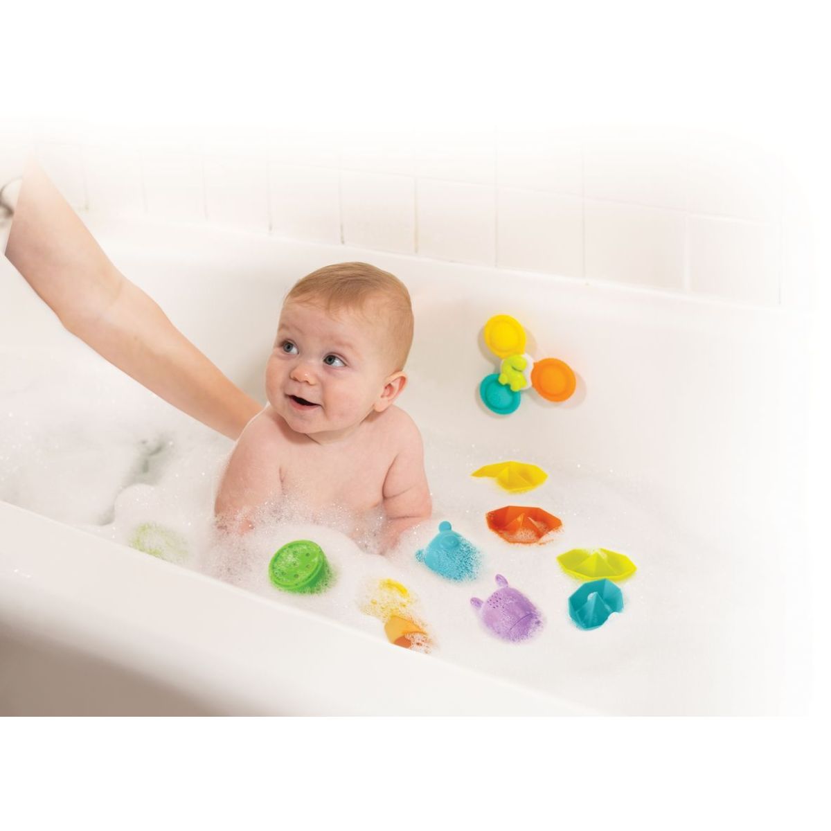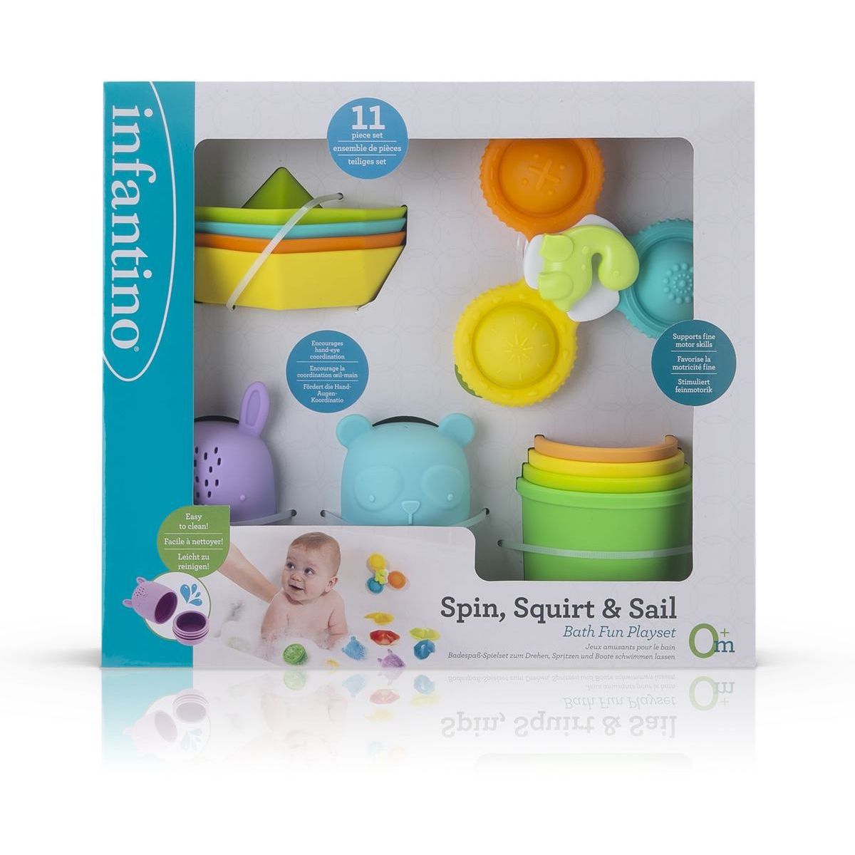 Infantino Sada hraček do koupele Spin, Squirt & Sail promění každé koupání v magický zážitek plný objevování a zábavy. Jedenáct pestrobarevných silikonových hraček – stohovatelné lodě, stříkající zvířátka, stabilizační kelímky a vířivá spinner hračka – podporuje jemnou motoriku, koordinaci a rozvoj představivosti. Díky měkkému a bezpečnému materiálu se hračky snadno drží a čistí, což zaručuje bezpečnou a radostnou hru ve vodě.