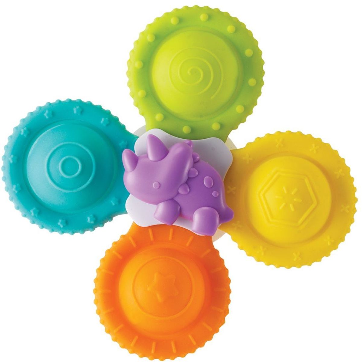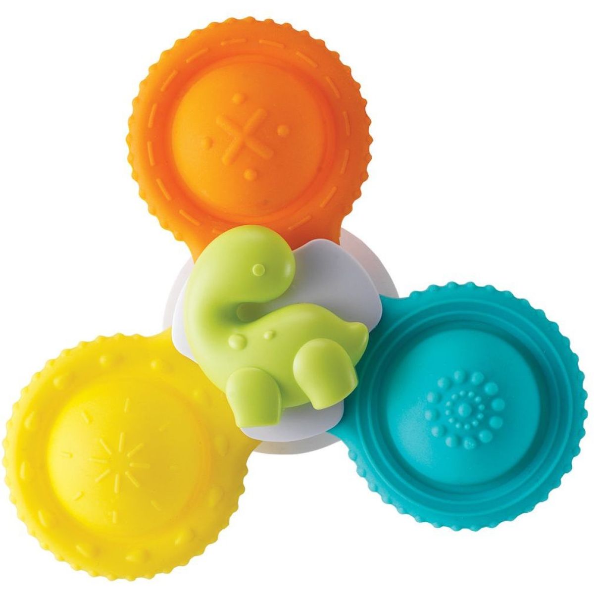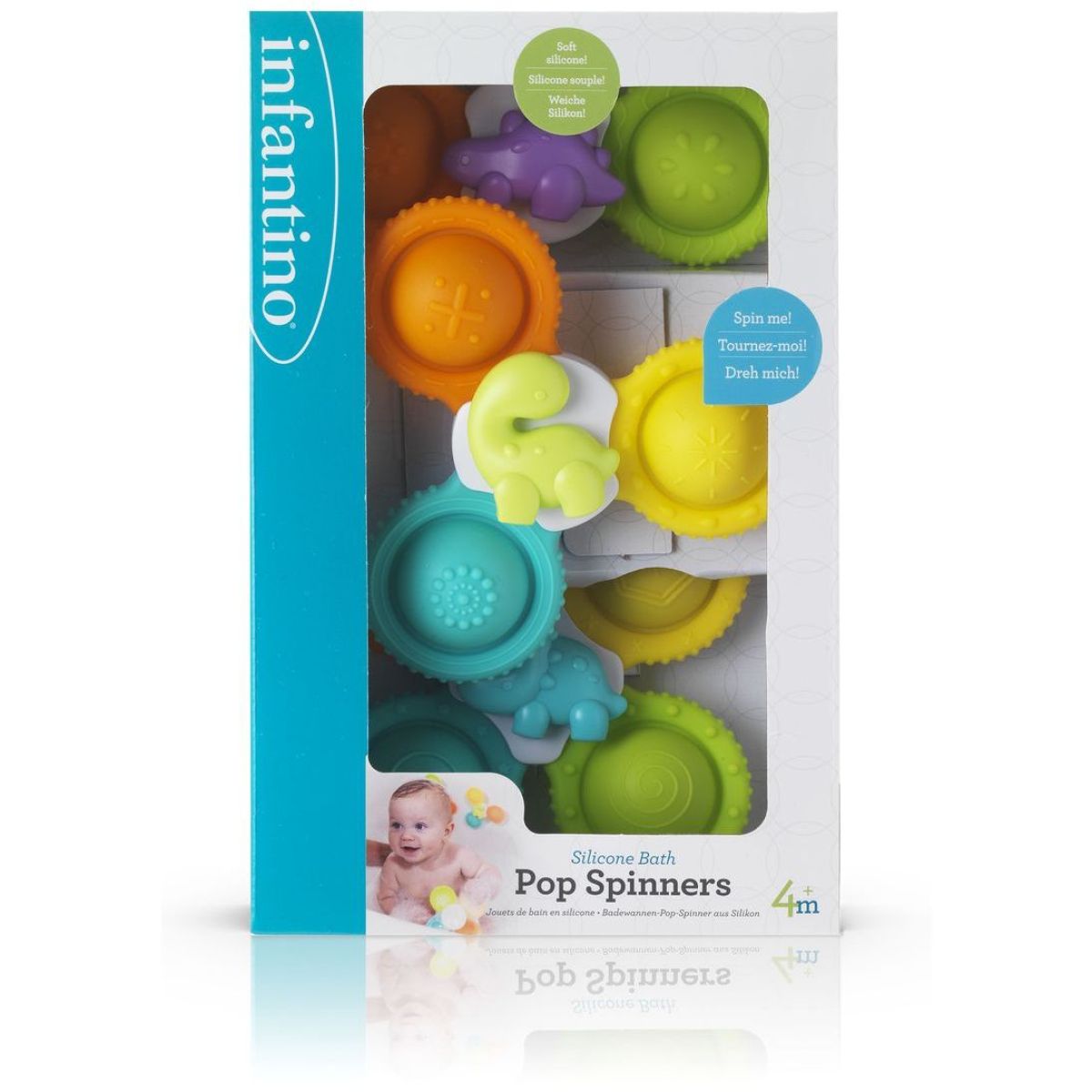 nfantino Pop Spinners do koupele promění každou koupel v zábavnou hru. Sada tří barevných spinnerů s přísavkou se snadno připevní na vanu a umožní dětem otáčet je jeden po druhém. Spinner s dinosaurem ve středu a jemný silikon podporují rozvoj jemné motoriky a koordinaci smyslů. Díky atraktivnímu designu se stanou oblíbenou hračkou při každodenní koupeli.