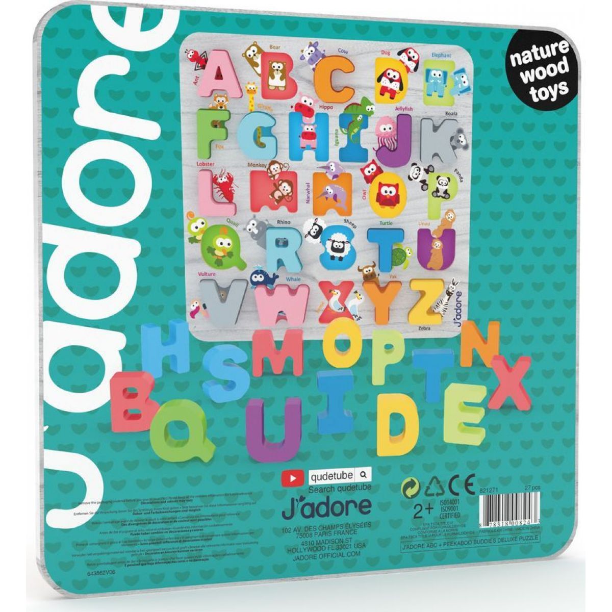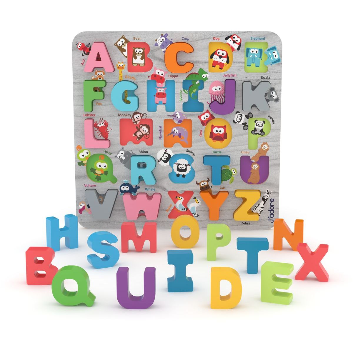 Holčičky a kluci mohou vkládat tvary velkých tiskacích písmen do správných výřezů. Formou hry se učí poznávat a pojmenovávat jednotlivá písmena. J`adore je řada vzdělávacích hraček pro nejmenší, vyrobených z ekologicky udržitelného dřeva.