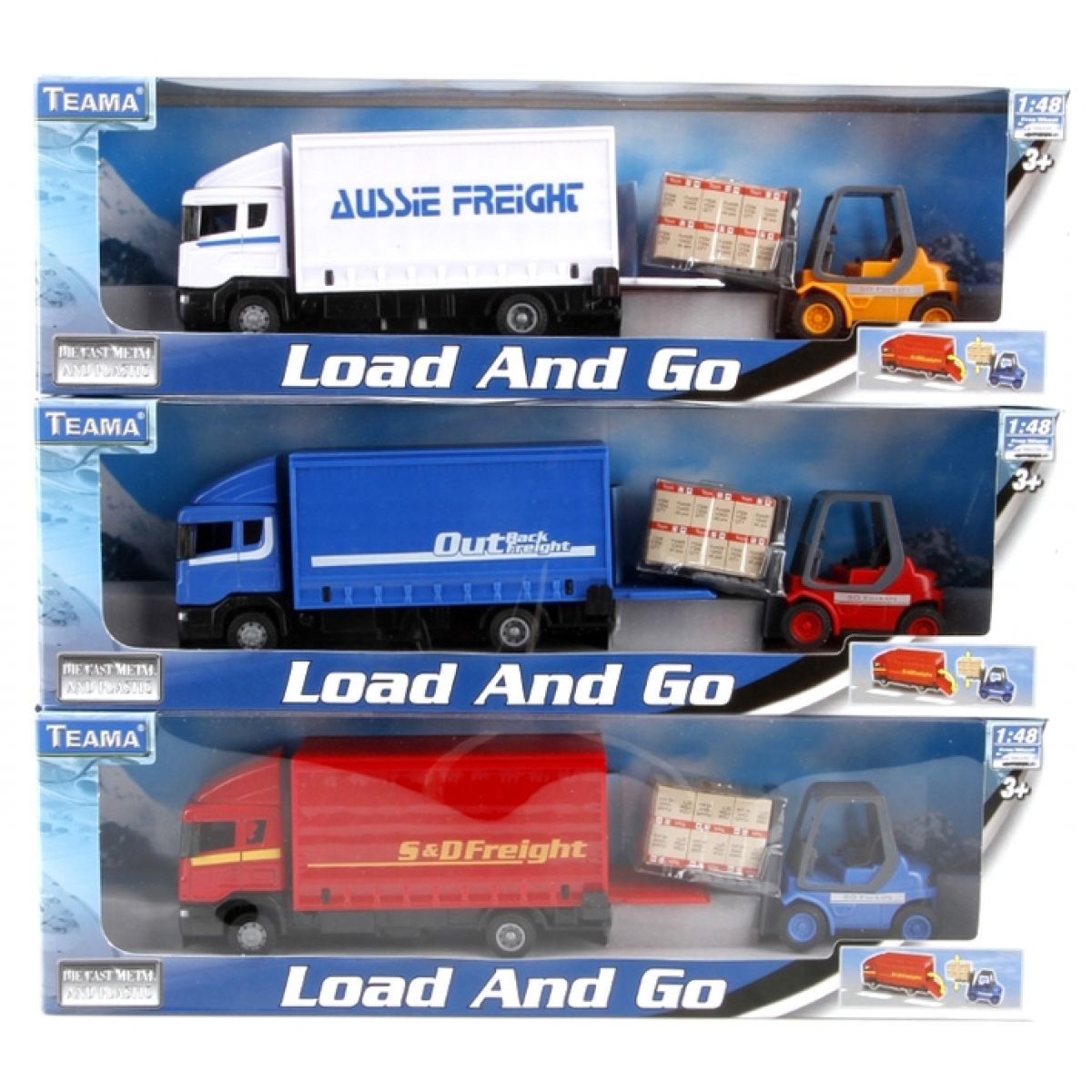 Nákladní auto a vysokozdvižný vozík včetně nákladu.