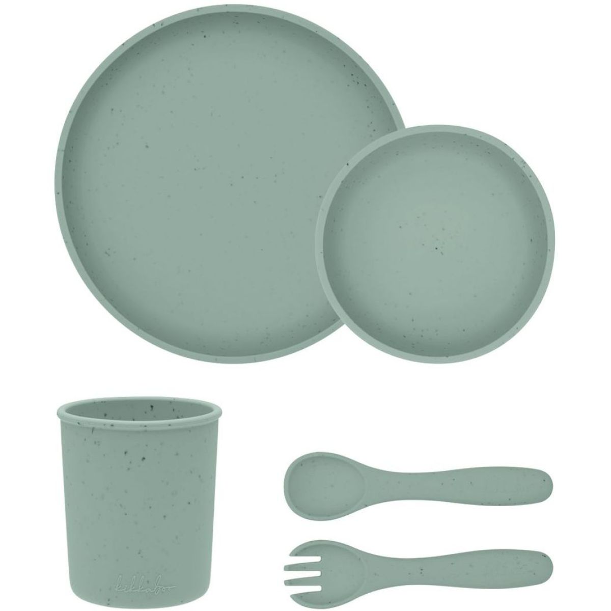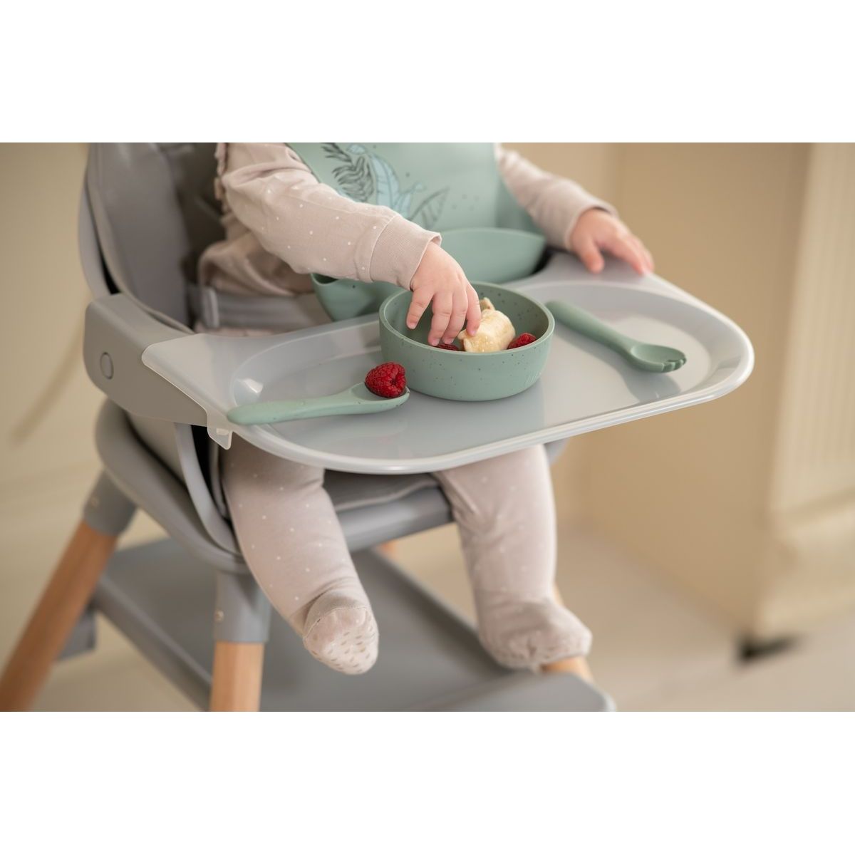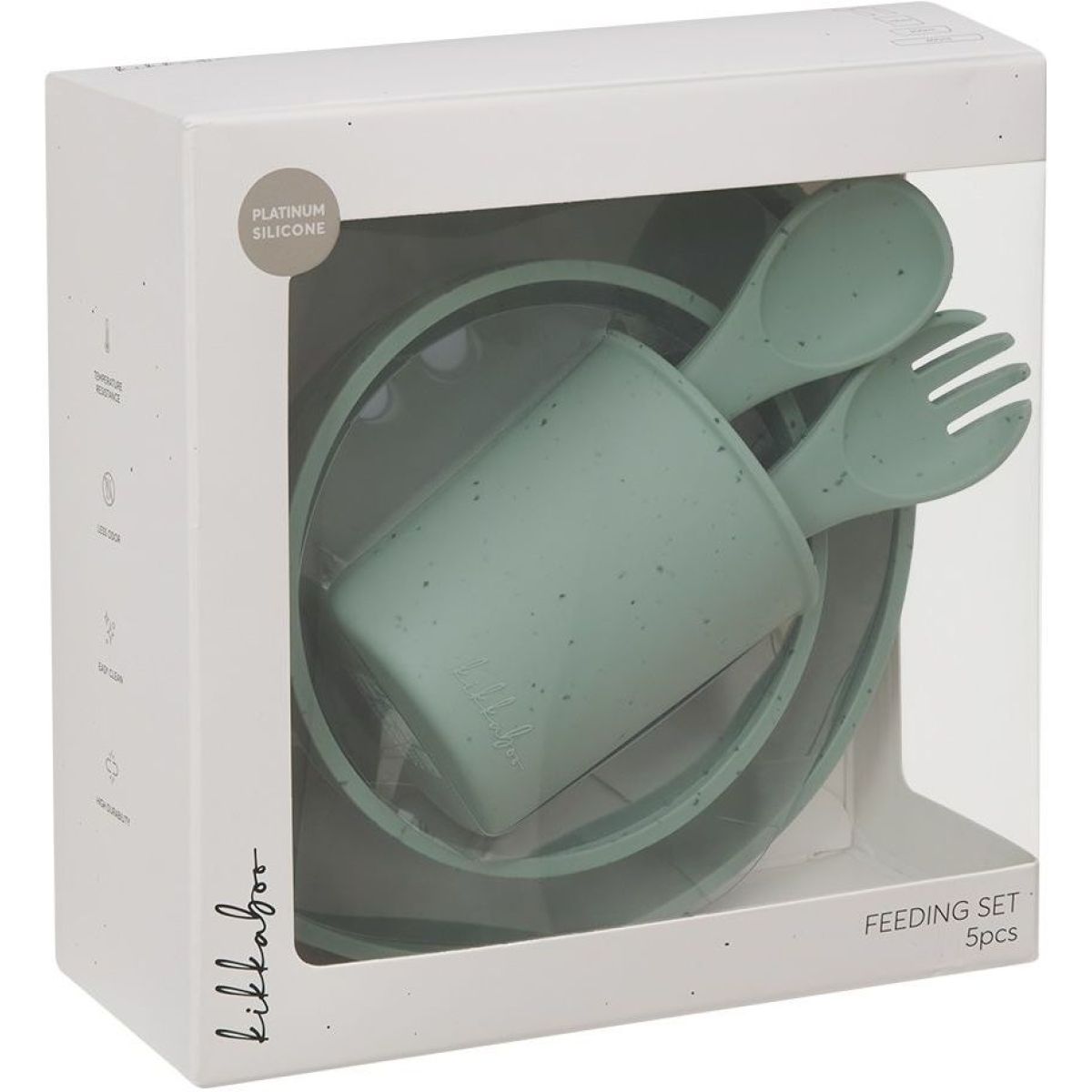 Dětská jídelní sada KikkaBoo Platinum Silicone Sage usnadní malým objevitelům samostatné stolování. Talíř se zvýšeným okrajem a ergonomická lžička s vidličkou s měkkými hranami podporují pohodlné nabírání jídla, kelímek padne do dětských ruček a miska je ideální na polévku či kaši. Prémiový 100 % platinum silikon je měkký, odolný a hypoalergenní, odolává teplotám od –40 °C do 230 °C a je snadno omyvatelný i vhodný do myčky, mikrovlnné trouby a sterilizátoru.