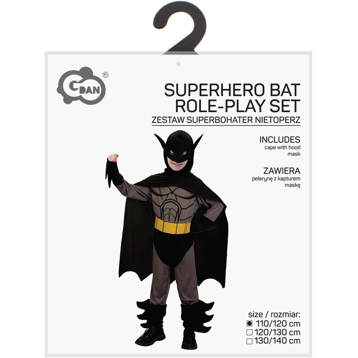 Ikonický žlutý pásek zvýrazňuje siluetu kostýmu a dodává mu autentický komiksový vzhled. Černý plášť s kapucí přechází v masku s netopýřími ušima, která dodává postavě tajemnost a charakter. Průzory pro oči zajišťují dobrý výhled a komfort při nošení. Plášť sahající pod kolena spolu s návleky na nohy ve tvaru netopýřích křídel vytváří působivý celek, který zaujme na první pohled. Kostým je ideální volbou pro karnevaly, tematické oslavy i domácí hry plné dobrodružství.