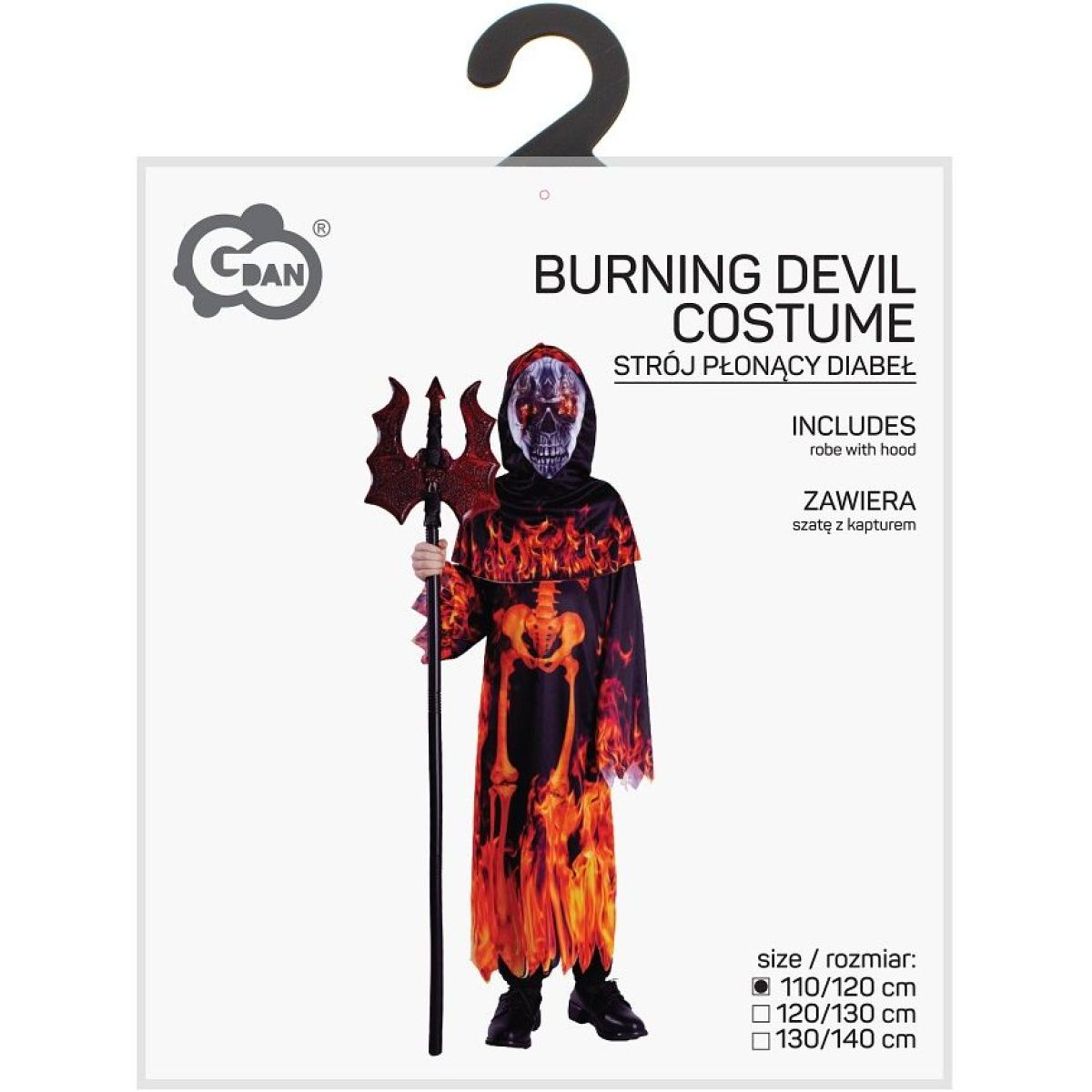 Dlouhý černý plášť z lehkého materiálu zdobí realistický motiv kostry a plamenů, takže celý outfit působí jako „hořící“ ďábelský převlek. Nepravidelné zakončení rukávů i spodního lemu přidává dramatičnost a při chůzi nebo běhu vypadá kostým ještě efektněji. Kapuce je součástí pláště a vpředu ji dominuje potisk lebky s planoucíma očima – detail, který okamžitě dotvoří tajemnou atmosféru.