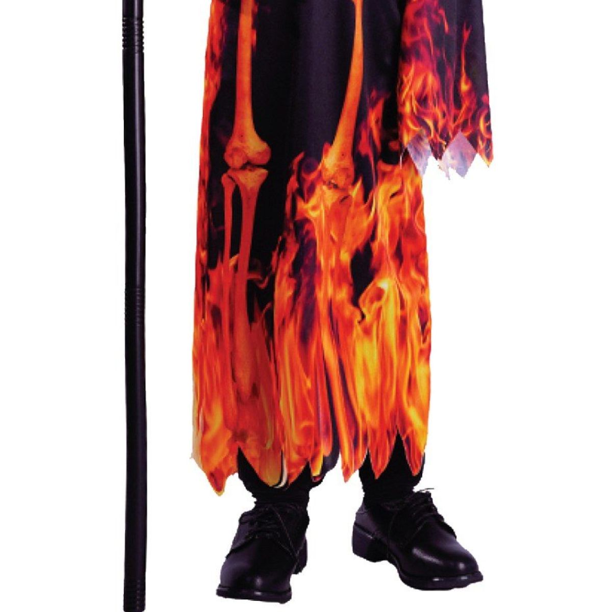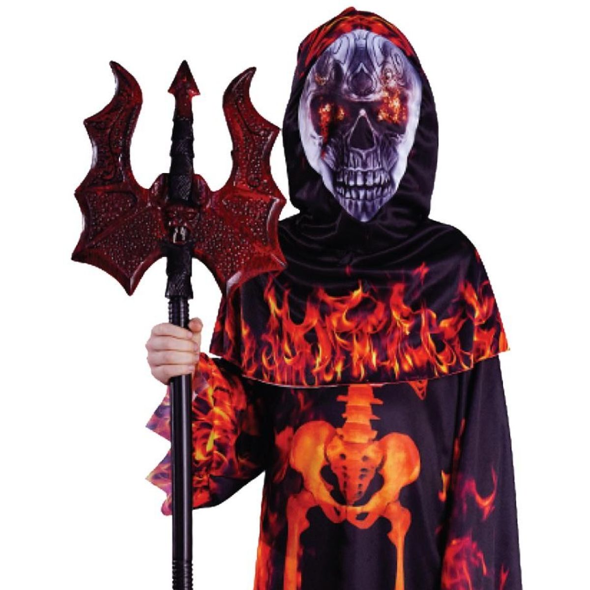 Dlouhý černý plášť z lehkého materiálu zdobí realistický motiv kostry a plamenů, takže celý outfit působí jako „hořící“ ďábelský převlek. Nepravidelné zakončení rukávů i spodního lemu přidává dramatičnost a při chůzi nebo běhu vypadá kostým ještě efektněji. Kapuce je součástí pláště a vpředu ji dominuje potisk lebky s planoucíma očima – detail, který okamžitě dotvoří tajemnou atmosféru.