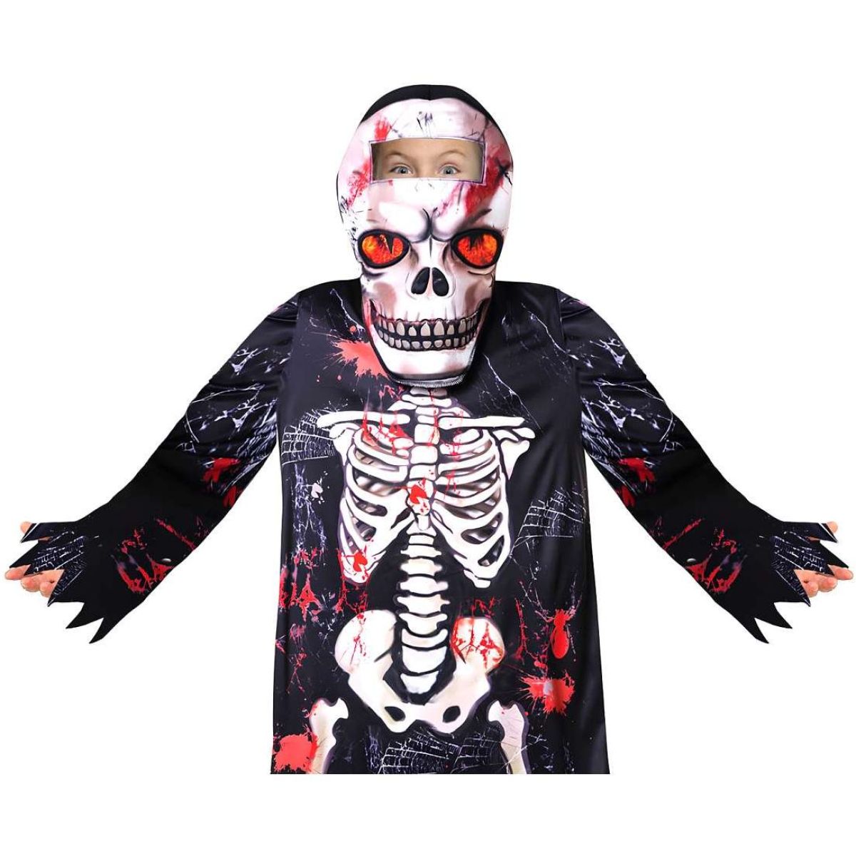 Černý plášť s roztřepenými okraji zdobí výrazná bílá kostra doplněná červenými „krvavými“ detaily a motivy připomínajícími pavoučí sítě. Špičaté cípy na rukávech dodávají siluetě dramatický vzhled a při běhu nebo tanci vypadají opravdu efektně. Hlavním tahákem je maska s kapucí: lebka s velkými oranžovými očima a černými prvky působí strašidelně, přitom má otvor pro oči, aby dítě dobře vidělo a cítilo se pohodlně.
