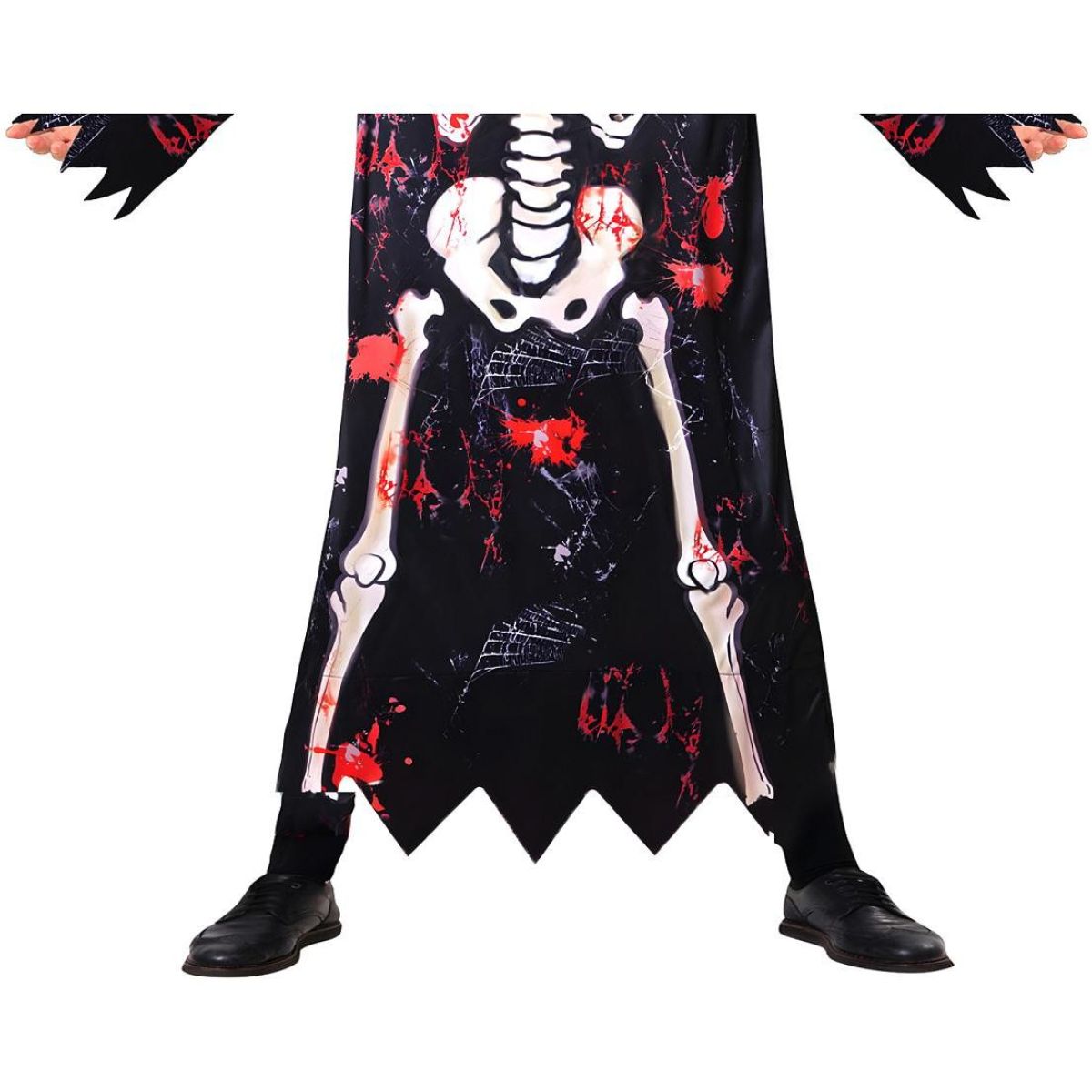 Plášť: dlouhý, roztrhané okraje, potisk kostry, červené skvrny a detaily (krev, pavoučí sítě)
